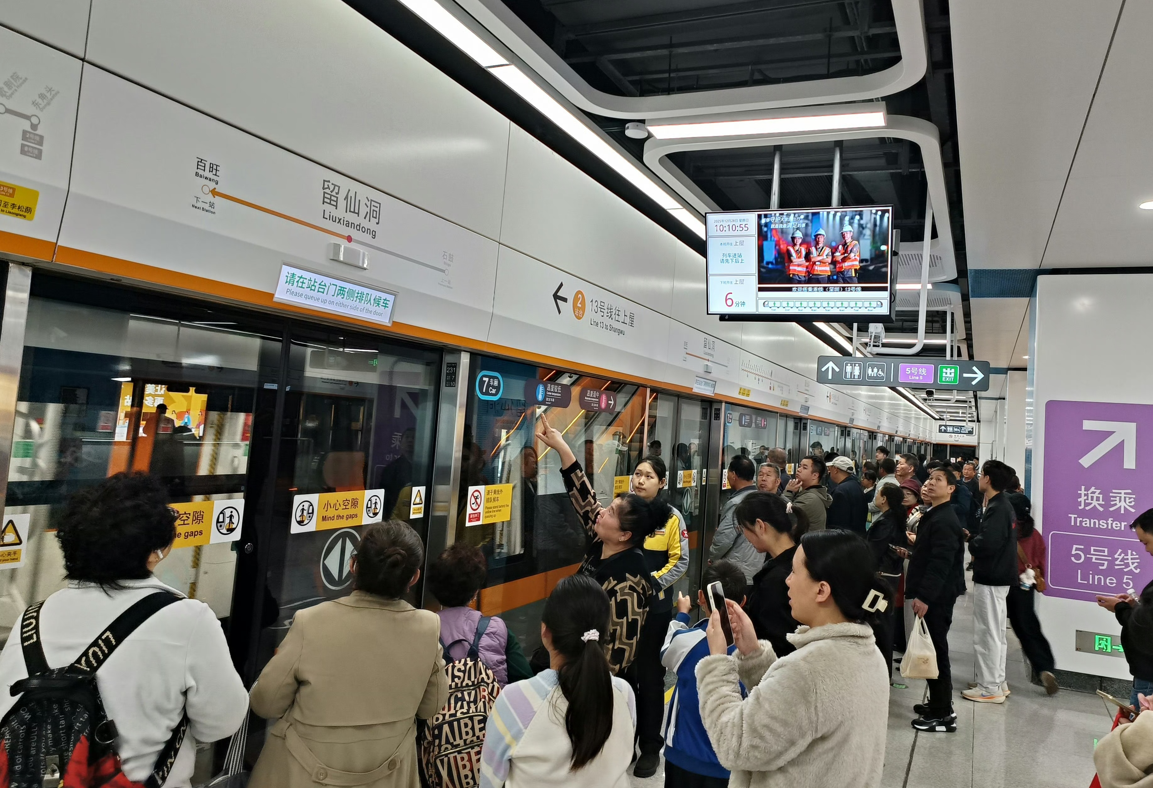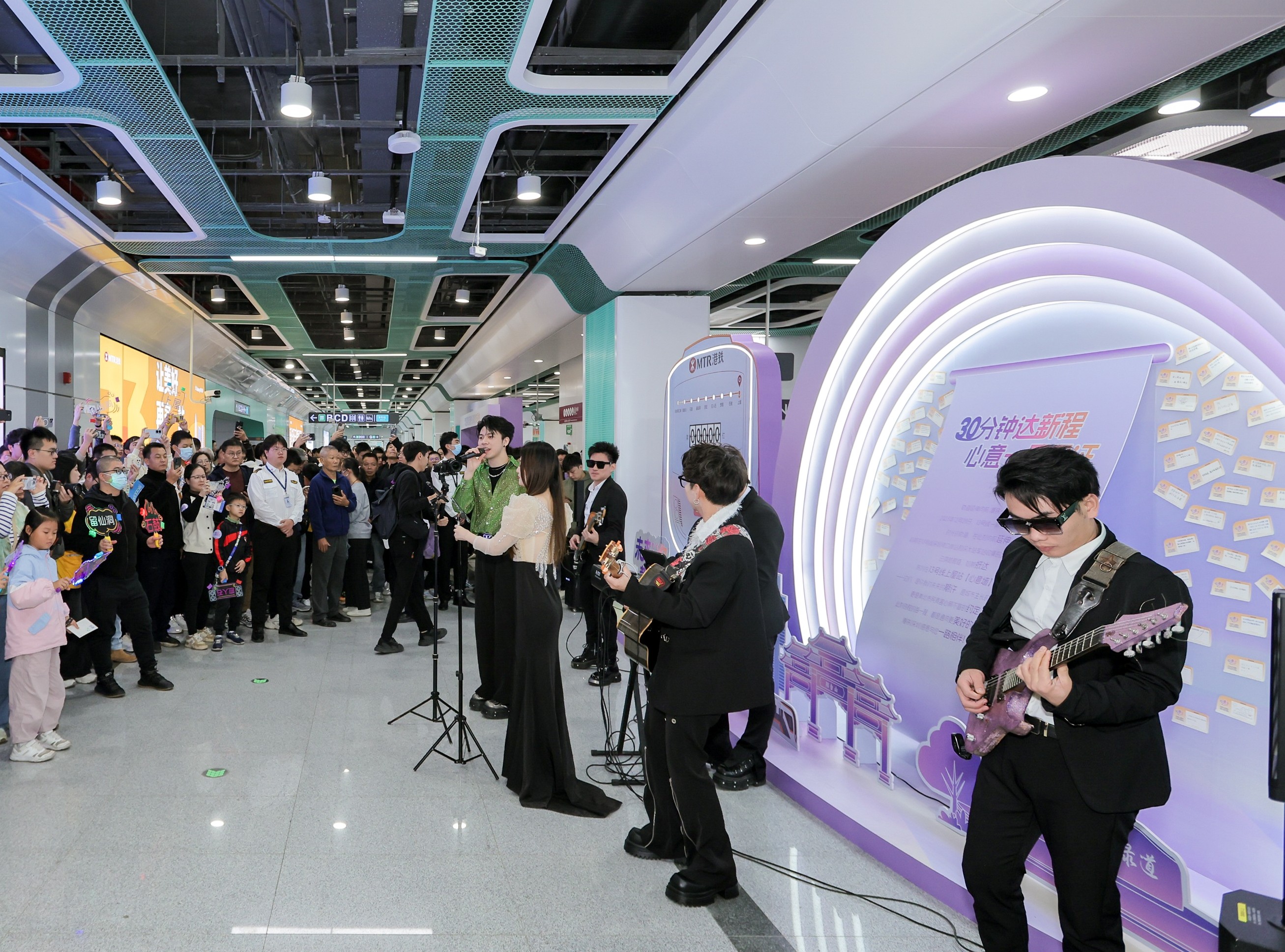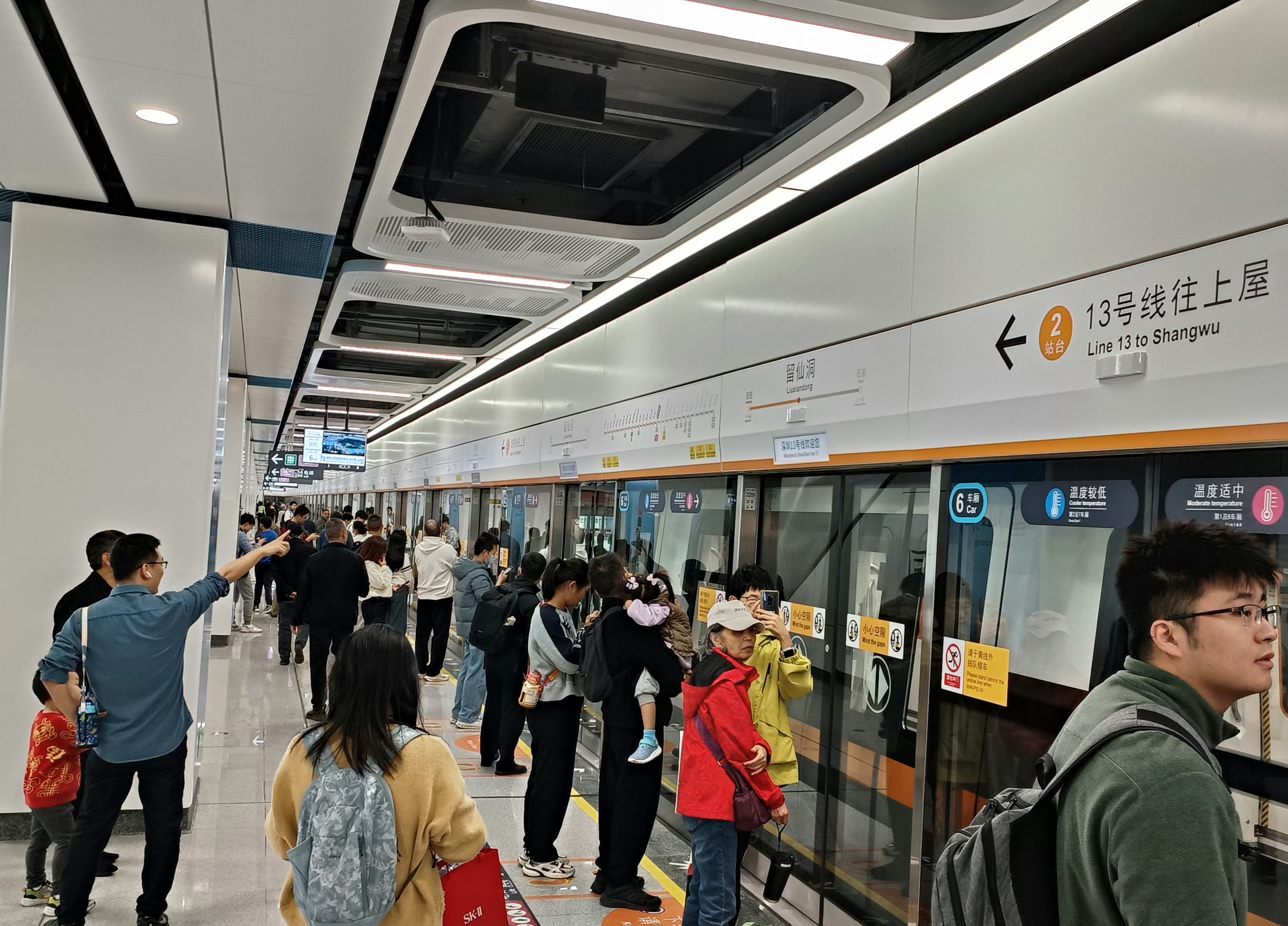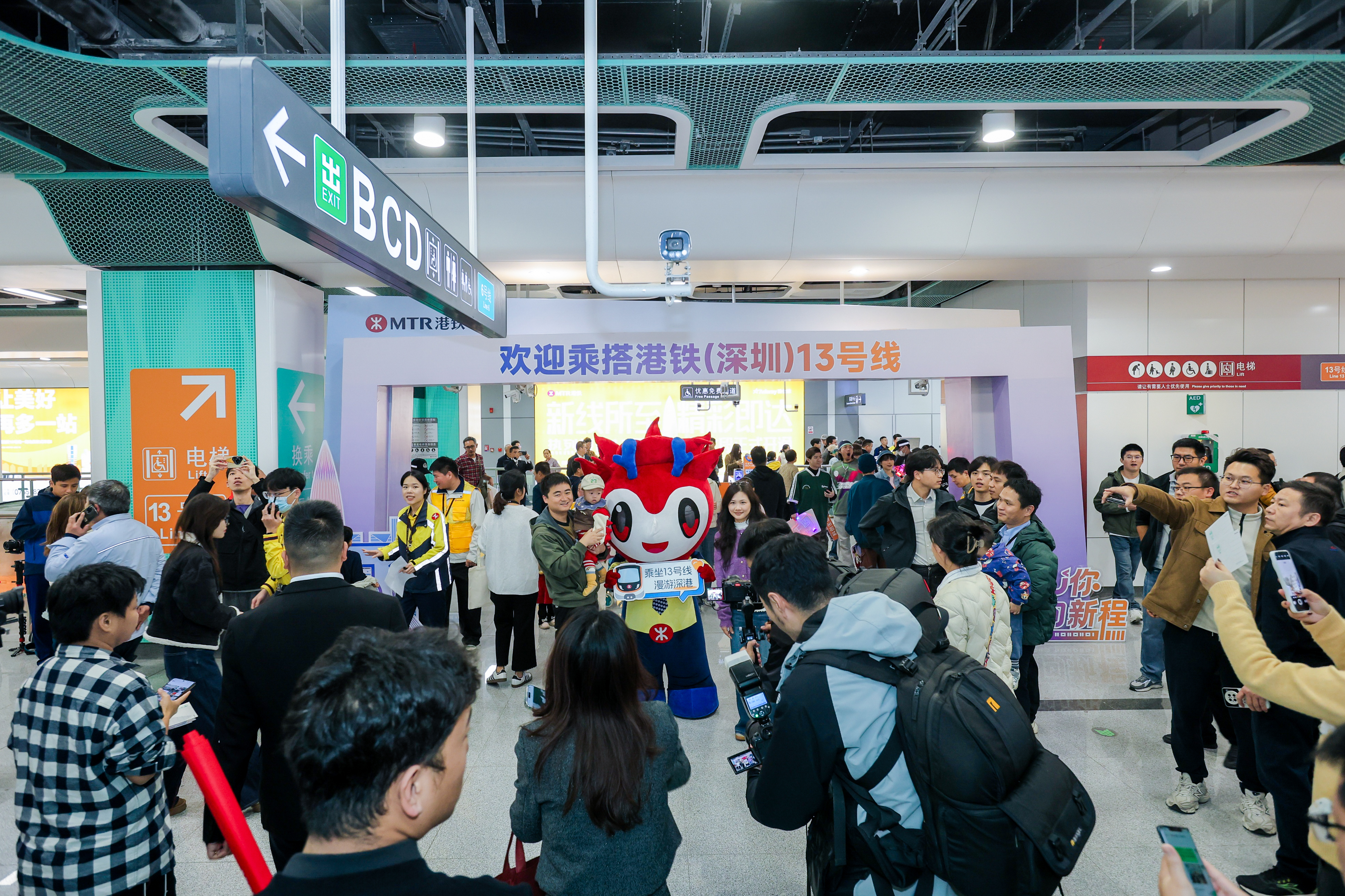 首發當日,豐富的特色活動讓出行充滿儀式感。車廂內輪番上演精彩的聲樂表演,掃碼參與互動,就能贏取限量開通紀念票。深圳灣口岸站和上屋站設置的簽名祝福牆前人頭攢動,乘客紛紛寫下對新線開通的祝福;沿線車站還推出專屬紀念卡領取活動,收集印章可兌換限量文創紀念品。石岩站同步上線「13號線城市漫遊樂Fun天」打卡點,集中推薦沿線遊玩景點與休閒場所,為市民和港人出行提供精準指引。
