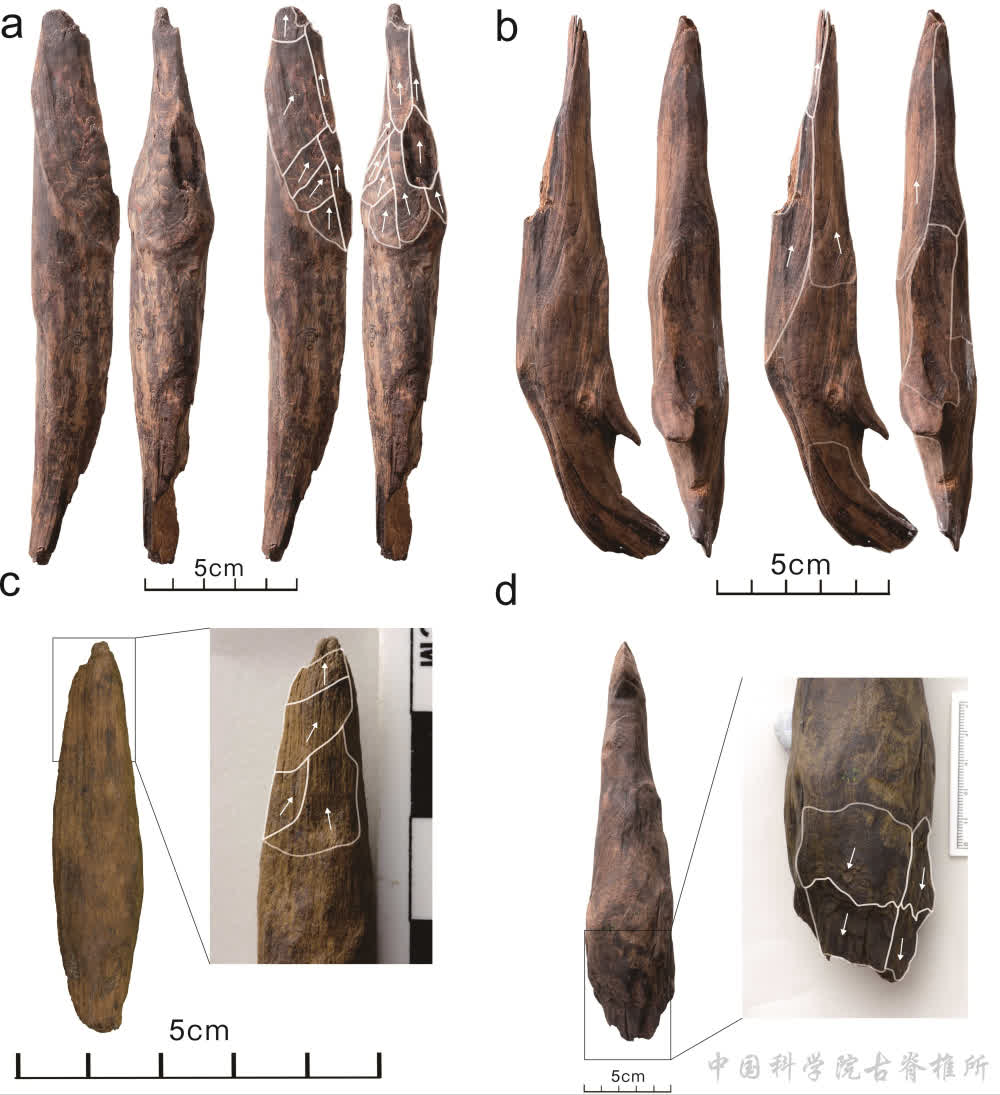 這些木器主要用松木製作,宏觀和顯微觀察發現:一些標本存在因砍枝削尖而留下的削刮痕,尖端發生因使用而產生的磨光條痕和斷裂破損。這些痕迹出現在特定部位並具有方向性,是人類加工與使用的證據。
