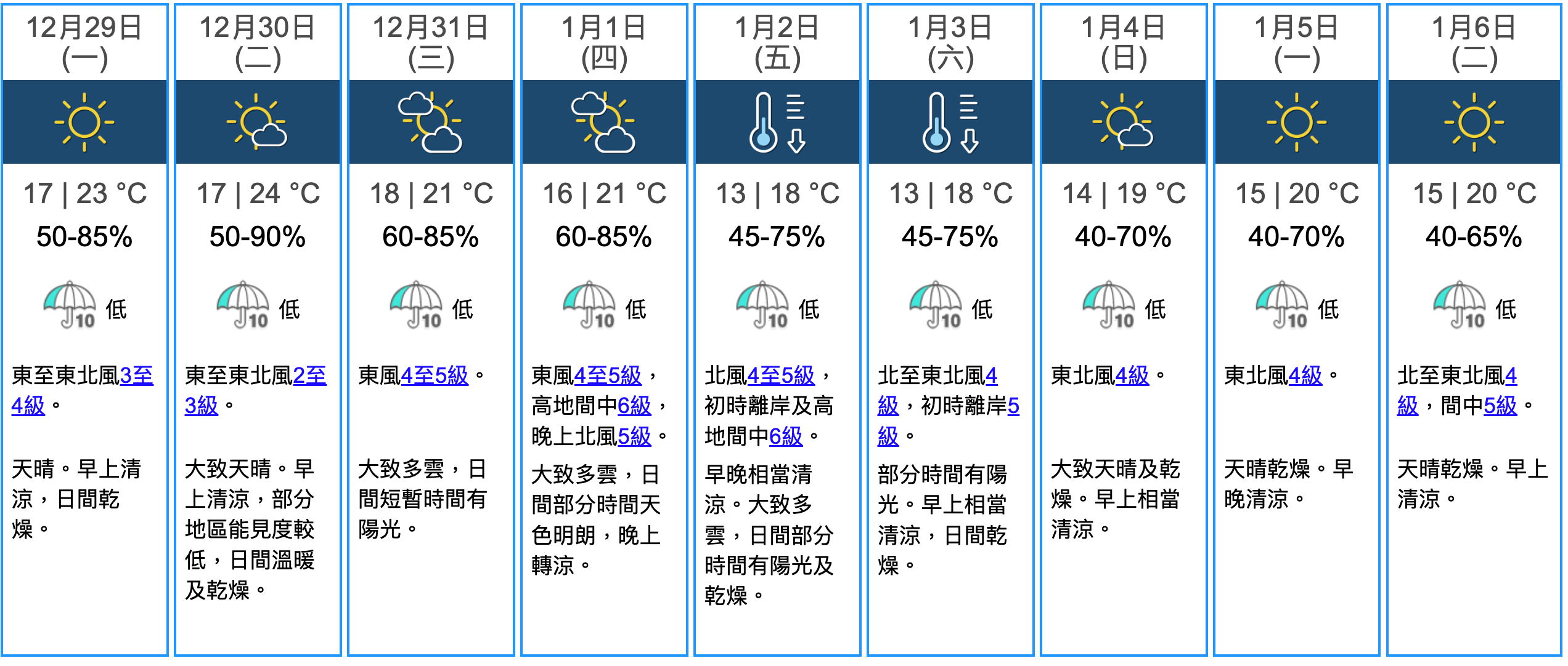 根據天文台今日九天天氣預報,周二最高氣溫可回升至24度,周三除夕氣溫約18至21度。元旦日過後,天氣會顯著轉涼,周五(1月2日)早晚相當清涼,大致多雲,氣溫會跌至最低13度,比元旦日最高氣溫急跌8度,周六同樣最低氣溫只有13度。