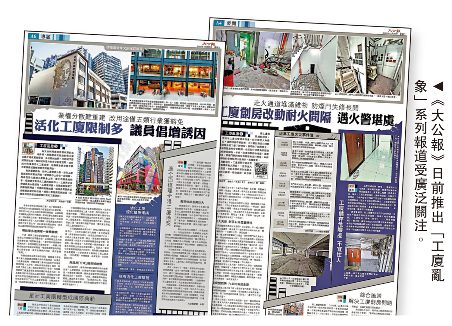 (大公報 記者 馮錫雄)《大公報》日前推出《工廈亂象》系列專題,揭示劏房由住宅單位蔓延至工廠大廈,同時就活化工廈政策如何優化,引述多位專家及議員建議,為特區政府出謀獻策,報道引起社會正面回響。發展局回覆查詢時表示,針對工廈劏房問題,從安全角度必須取締,屋宇署會按《建築物條例》作出檢控;此外,城市規劃委員會過去三年,共收到七宗重建工廈申請,其中五宗已獲批准,其餘兩宗正在處理。