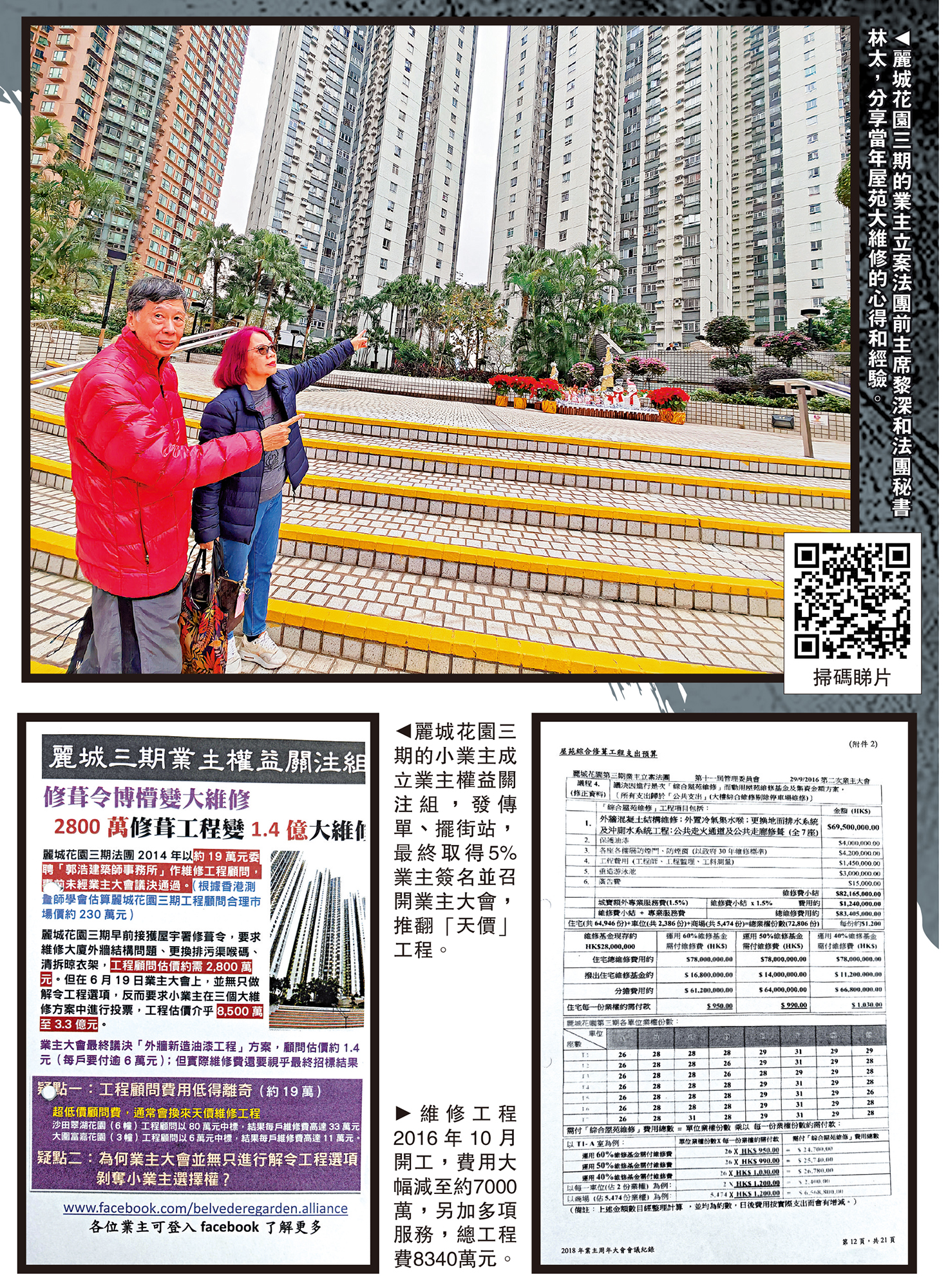 「完成大維修工程,平均每個大單位只需付3.2萬多元,扣減大廈維修基金的7000元補貼,平均每戶大單位只需繳交2.5萬元左右,當中還包括了全部更換所有樓層的防煙門窗及翻新泳池的工程。」麗城花園三期的業主立案法團前主席黎深和法團秘書林太,拿着當年各項維修費的工程價單,向大公報記者分享當年屋苑大維修的心得和經驗。