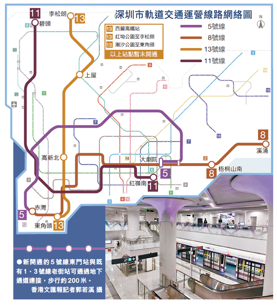 隨着深圳地鐵5號線西延段、11號線二期紅嶺南段等線路的開通運營,東門、湖貝、大劇院三大熱門商圈地下交通網絡實現大幅擴容,形成5線互聯格局。香港文匯報記者實地探訪發現,新開通的5號線東門站與既有1、3號線老街站可通過地下通道連接,步行約200米,但暫無法實現站內無縫換乘,需刷卡出站後再重新購票或刷卡進站乘車。
