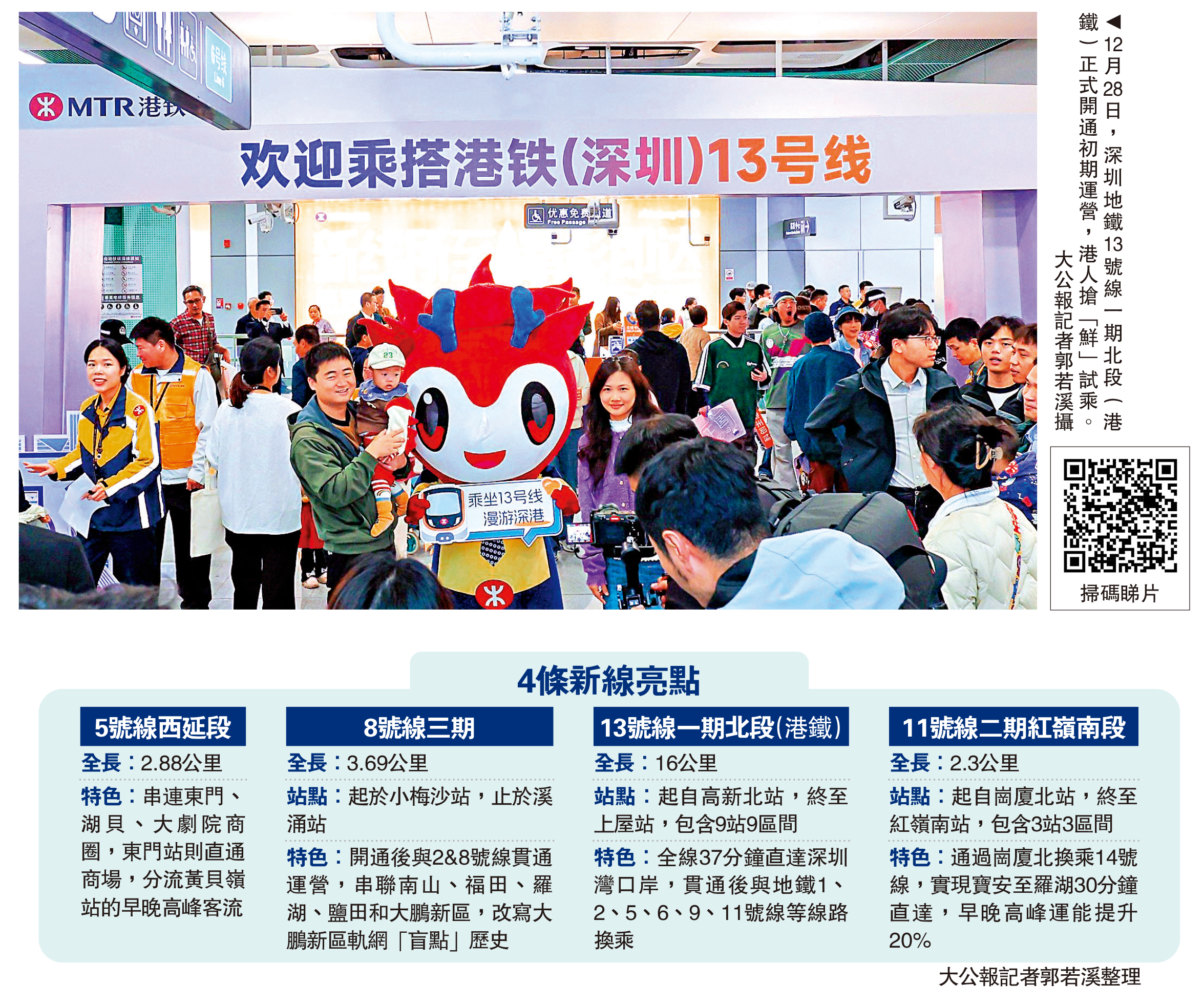 (大公報 記者 郭若溪 深圳報道)往返深港,方便快捷。昨日上午10時18分,深圳地鐵5號線西延段8號線三期、11號線二期(紅嶺南段)、13號線一期北段(港鐵)四條線路正式開通初期運營。全市軌道交通運營里程增至634.5公里,車站441座,實現「區區通地鐵」,線網密度達到0.32公里/平方公里,穩居全國內地城市首位。深圳地鐵客流也將進一步增長,日均客運量預計將突破900萬人次。