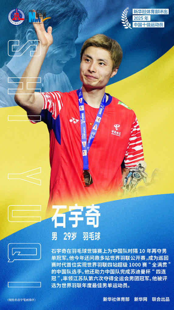 石宇奇在羽毛球世錦賽上為中國隊時隔10年再奪男單冠軍。他今年還問鼎多站世界羽聯公開賽,成為巡迴賽時代首位實現世界羽聯四站超級1000賽「全滿貫」的中國隊選手。他還助力中國隊完成蘇迪曼杯「四連冠」,率領江蘇隊第六次奪得全運會男團冠軍。他被評選為世界羽聯年度最佳男單運動員。
