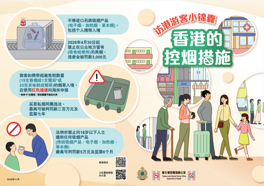 旅客方面,控煙酒辦在所有出入境口岸,及於主要旅遊景點及巴士站加強禁煙宣傳和推廣,包括聯同區議員於主要旅遊景點派發宣傳單張,亦特意編製「訪港遊客小錦囊」以一圖看清方式,加深旅客對新措施的認識。控煙酒辦亦透過中國內地社交媒體向旅客推廣。