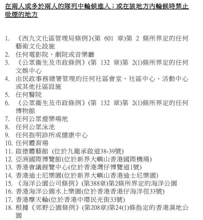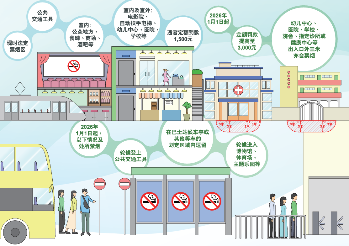 相關修訂內容包括:擴大法定禁煙區至幼兒中心、院舍、學校、醫院、指明診所及健康中心的專用出入口3米範圍內的公眾地方;排隊時禁止吸煙,包括禁止在指定登上交通工具地點輪候公共交通工具時、在指定登上交通工具地點的劃定範圍內逗留時,以及輪候進入指定處所或在指定處所內輪候時吸煙;及吸煙罪行定額罰款金額由1500元提高至3000元。