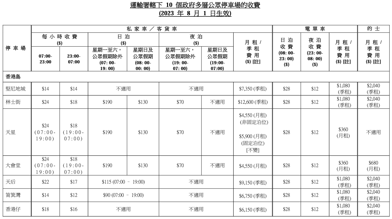 運輸署轄下10個公眾停車場遍布各區,包括堅尼地城停車場、林士街停車場、天星停車場、大會堂停車場、天后停車場、筲箕灣停車場、香港仔停車場、雙鳯街停車場、葵芳停車場及荃灣停車場,收費較鄰近私營公眾停車場更平,地理位置優越,是不少自駕遊客的首選。除八達通外,不少停車場亦新增內地支付寶及微信支付等付款方式,便利「粵車」車主。