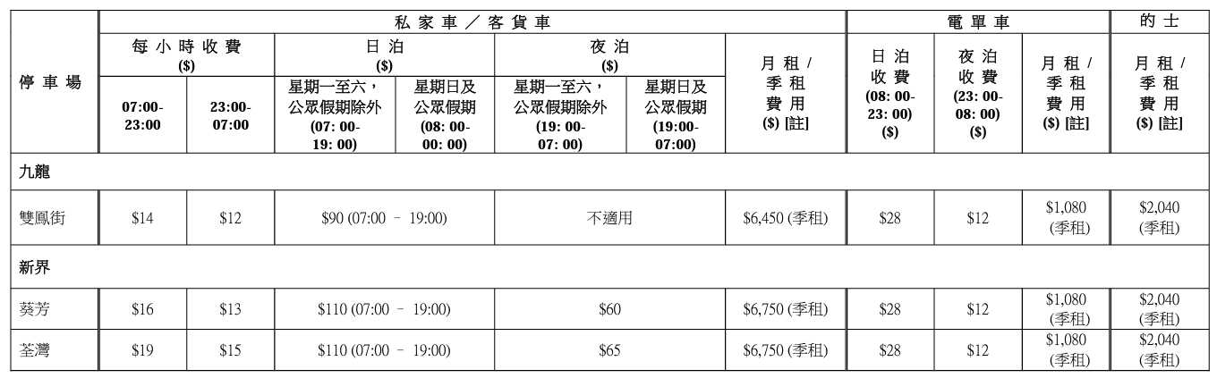 全港設有停車收費錶的車位超過20000個,收費時間大部分為星期一至六,每日上午8時至午夜12時,周日和公眾假期為早上10時至晚上10時。