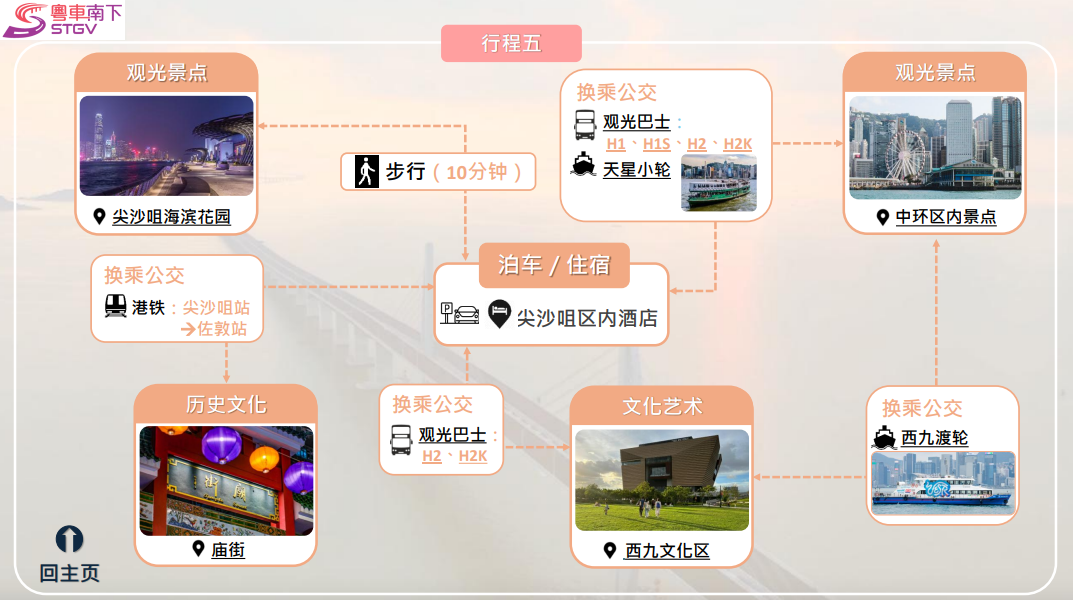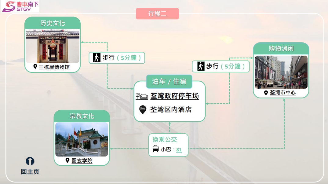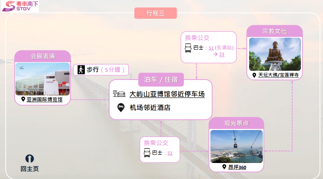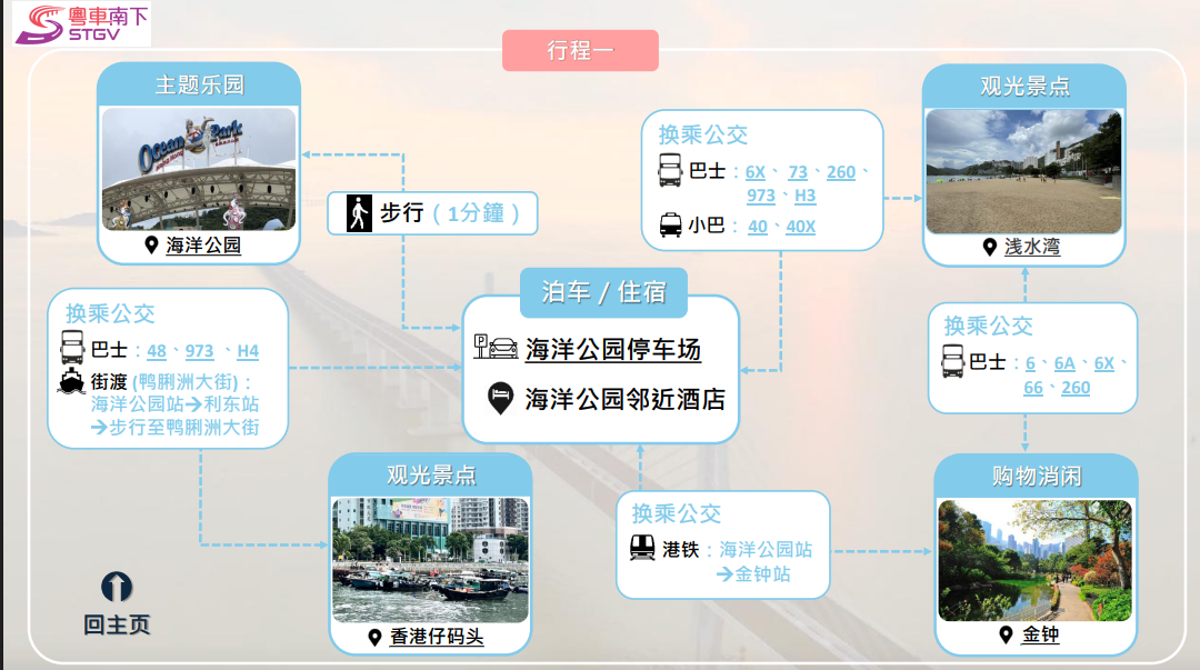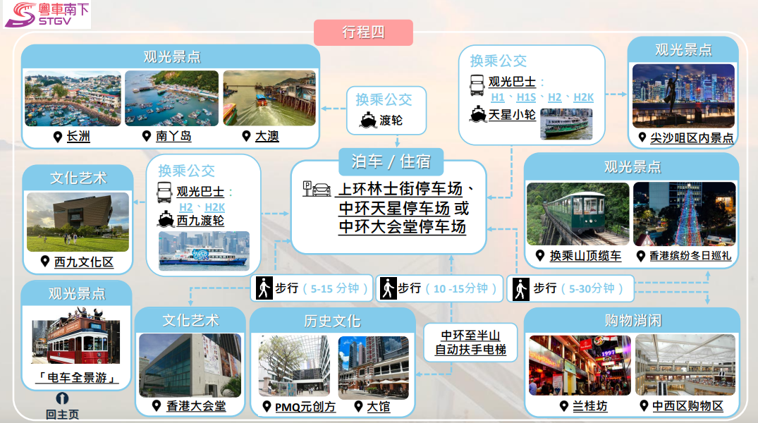 運輸署推出「旅遊泊車指南」,配搭自駕與公交,可按各自喜好選擇有關文化、體育、展覽、購物及主題樂園行程路線。