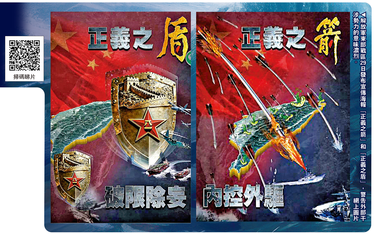 大公報綜合環球網、中通社報道,解放軍東部戰區29日宣布展開「圍台」軍演,並發布宣傳海報,分別寫道「正義之箭,內控外驅」及「正義之盾,破限除妄」,前者在圖中台灣地區地圖上畫滿導彈,後者則兩面印有中國萬里長城圖案和「八一」軍徽的盾牌,壓在台灣地圖上。有分析指出,海報中的兩塊盾牌正好卡住了宮古海峽和巴士海峽的這兩條外部勢力干涉的重要通道,且盾牌底部磨成刀鋒形狀,寓意是攻守兩用,要斬斷「台獨」妄想。
