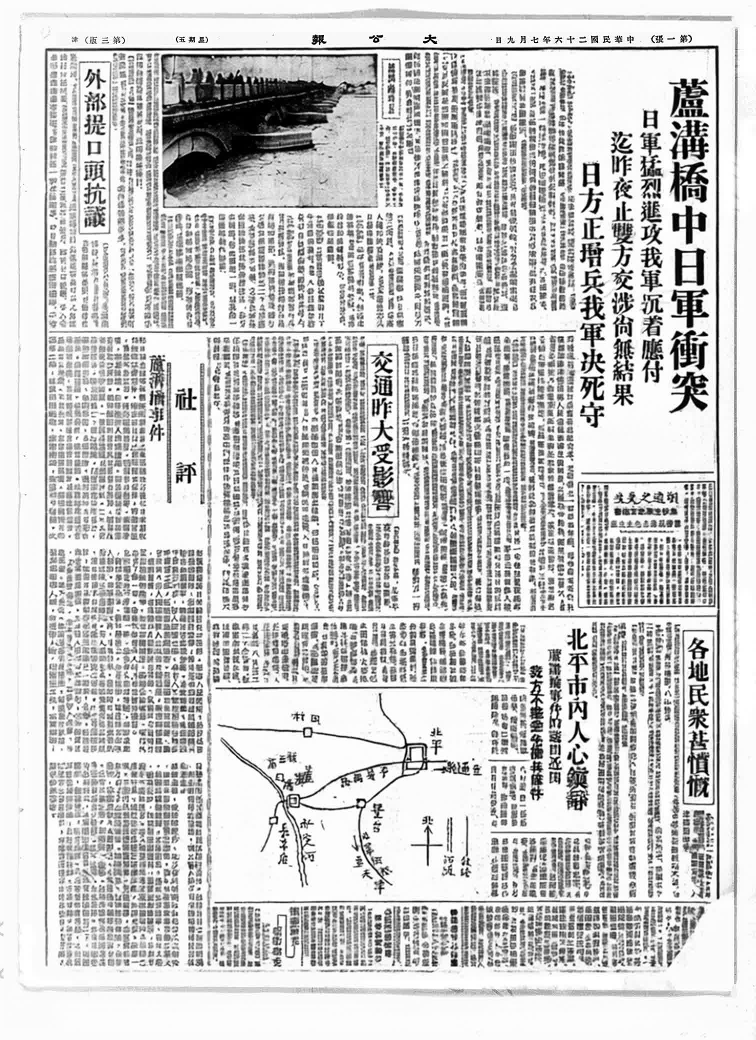 王芸生:盧溝橋已被日軍牢牢控制,我們的記者進不去,補拍基本不可能,只能等方大曾的照片。