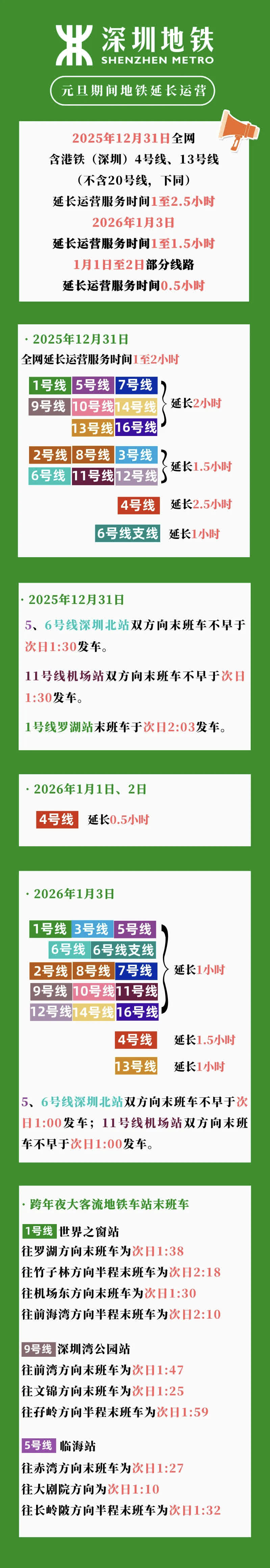 大公文匯全媒體報道,據深圳地鐵消息,為方便市民乘客於元旦假期出行,深圳市地鐵全網,包括港鐵(深圳)4號線、13號線,將於2025年12月31日延長運營服務時間1至2.5小時,於2026年1月3日延長運營服務時間1至1.5小時。1月1日至2日部分線路延長運營服務時間0.5小時。
