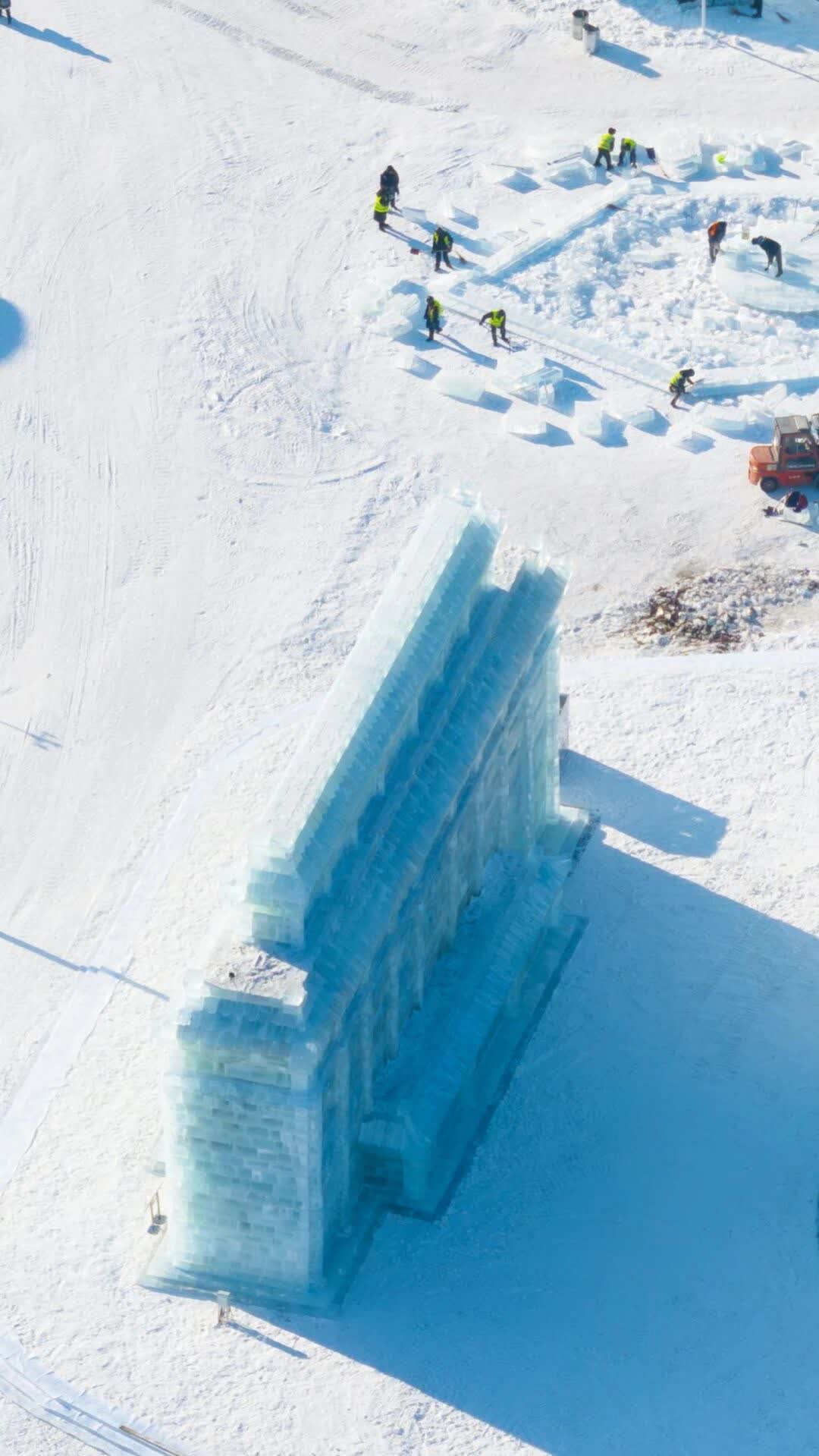 作品總計用冰約2450立方米,高14米、寬26.5米,由哈爾濱冰雕團隊精細雕琢而成。