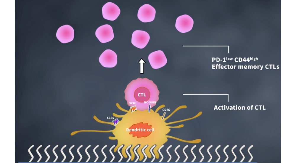 樹突細胞(Dendritic Cell, DC)治療則透過分離病人血液中的單核細胞,在體外與腫瘤抗原共同培養成成熟的樹突細胞,再回輸體內協助免疫系統攻擊癌細胞。雖副作用較少,但療效不穩定,製備過程亦繁瑣。為突破瓶頸,教大科學與環境學系生物與神經科學講座教授兼協理副校長(知識轉移與可持續發展)翁建霖教授領導的團隊,研發出天然無毒且高度生物相容的二氧化矽納米基質。此物料能以安全高效方式促進樹突細胞成熟,顯著增強T細胞對癌細胞的識別與攻擊能力,克服癌細胞「偽裝」問題,提升靶向精確度。動物實驗顯示,新技術能有效抑制腫瘤生長,延長免疫記憶並增強持續性。