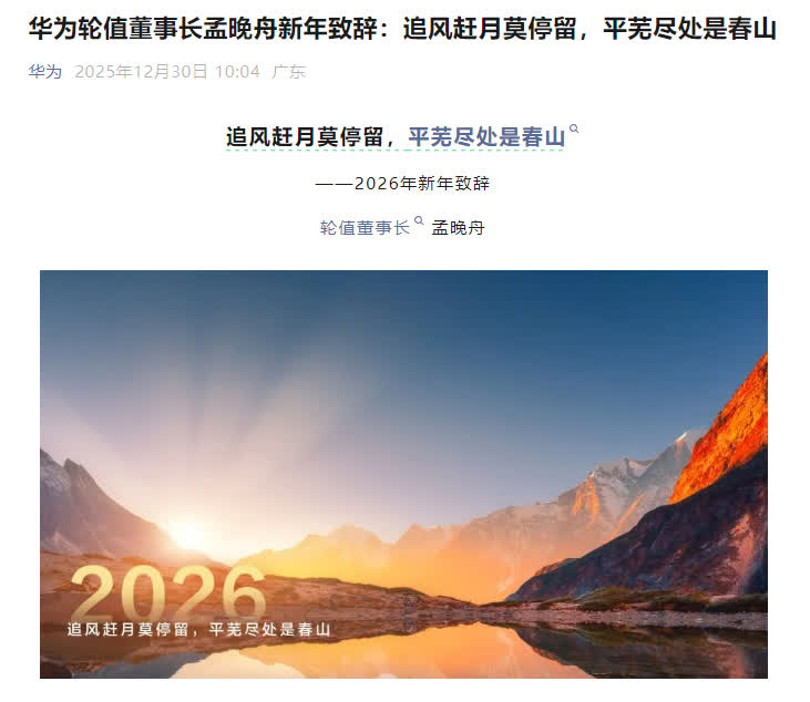 (大公文匯網 記者 毛麗娟)12月30日上午,華為官方公眾號發布了輪值董事長孟晚舟的2026年新年致辭《追風趕月莫停留,平蕪盡處是春山》。在致辭中,孟晚舟表示,人工智能技術正加速與行業知識融合,從單點效率提升轉向對企業核心業務的系統性價值重構。這場轉變不僅是技術的迭代,更是從組織架構、業務流程到企業文化的一次深刻變革。
