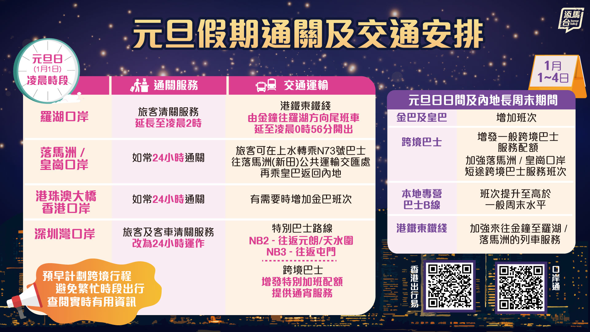 為應對在元旦假期期間的乘客需求,除了港珠澳大橋香港口岸及落馬洲/皇崗口岸如常24小時通關外,其他口岸亦有特別通關安排,而本地及跨境公共運輸均會加強服務。看圖了解詳情。