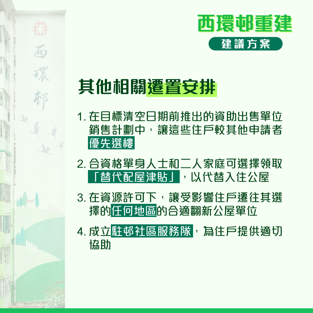 根據以往清拆項目的經驗,政府建議成立駐邨社區服務隊,為西環邨清拆計劃的受影響住戶提供適切協助。有關建議的清拆方案及遷置安排有待房委會通過並正式宣布落實。