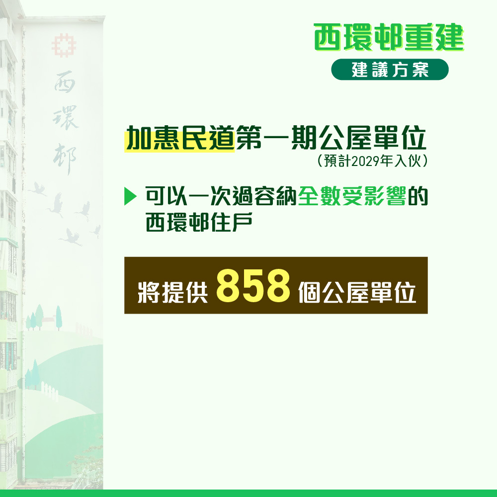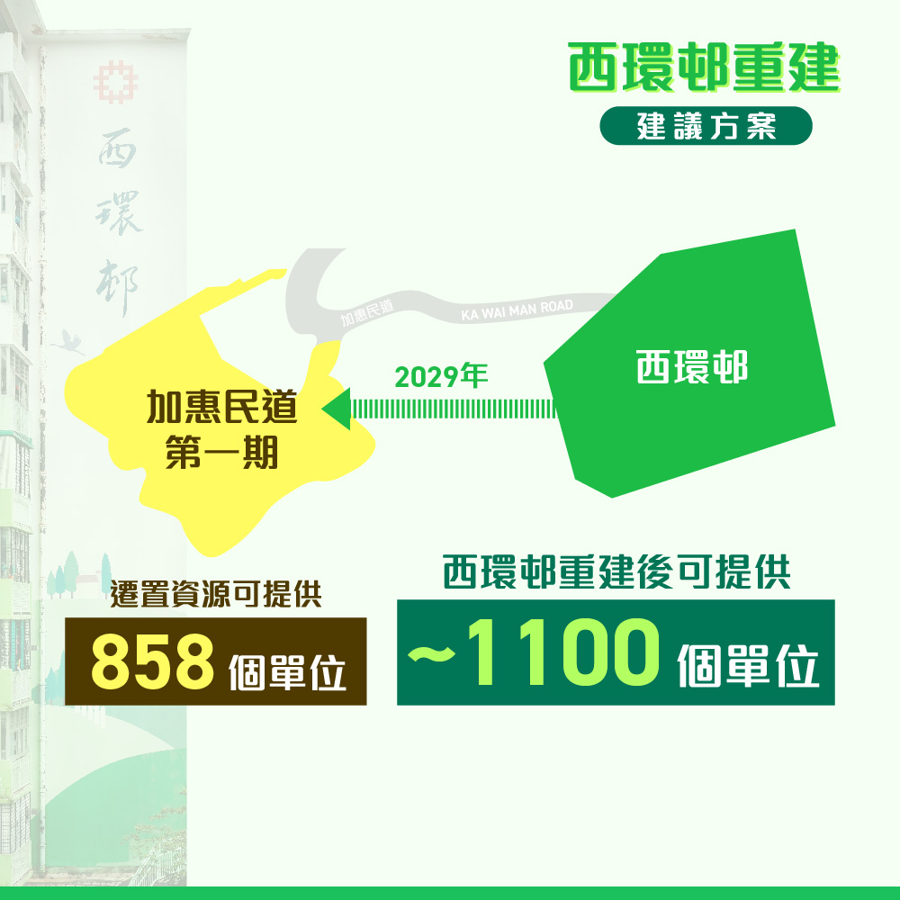 文件提到,西環邨現時有636個單位,建議將預計於2029年入伙的加惠民道第一期的公屋單位用作遷置資源。由於加惠民道第一期將會提供858個公屋單位,因此可以一次過容納全數受影響的西環邨住戶。房委會指,經過團隊的細心安排,這個方案可以讓街坊鄰里一同搬遷,保留原來屋邨的人情溫暖及延續對社區的歸屬感。
