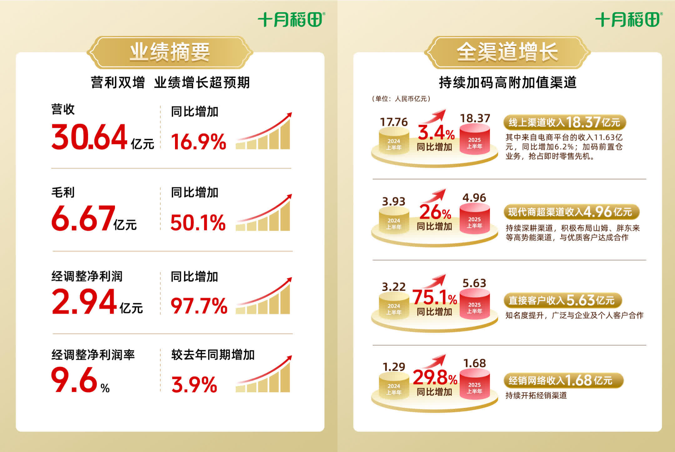 2025年,十月稻田完成了從「廚房食品企業」到「家庭食品行業創新者」戰略定位升級,企業公開數據顯示:上半年實現總收入30.64億元,同比增長16.9%;經調整凈利潤同比激增97.7%,盈利能力大幅提升。這不僅是財務數字的增長,更是其以創新重構家庭食品價值鏈、深度融入國家發展大局戰略的成功驗證。