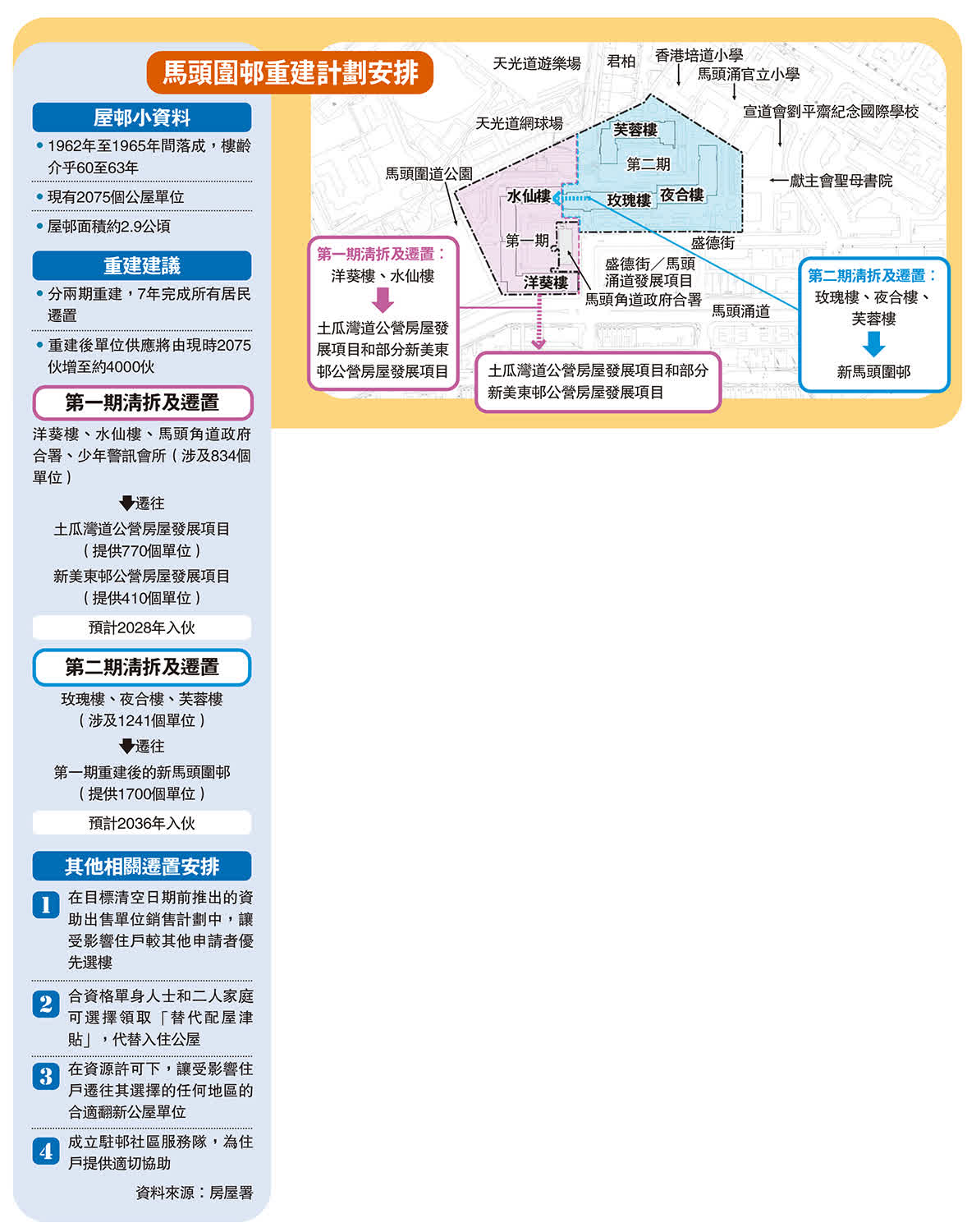 馬頭圍邨第一期清拆範圍包括洋葵樓及水仙樓,涉及834戶居民,預計可於2028年搬遷至土瓜灣道公屋或新美東邨接收單位;第二期將清拆玫瑰樓、夜合樓、芙蓉樓及相關配套設施,1241戶受影響住戶預計可於2036年遷往第一期重建後的新馬頭圍邨。馬頭圍邨現時有2075個單位,整個屋邨重建後,可以增至約4000個單位,單位數量近乎翻倍。