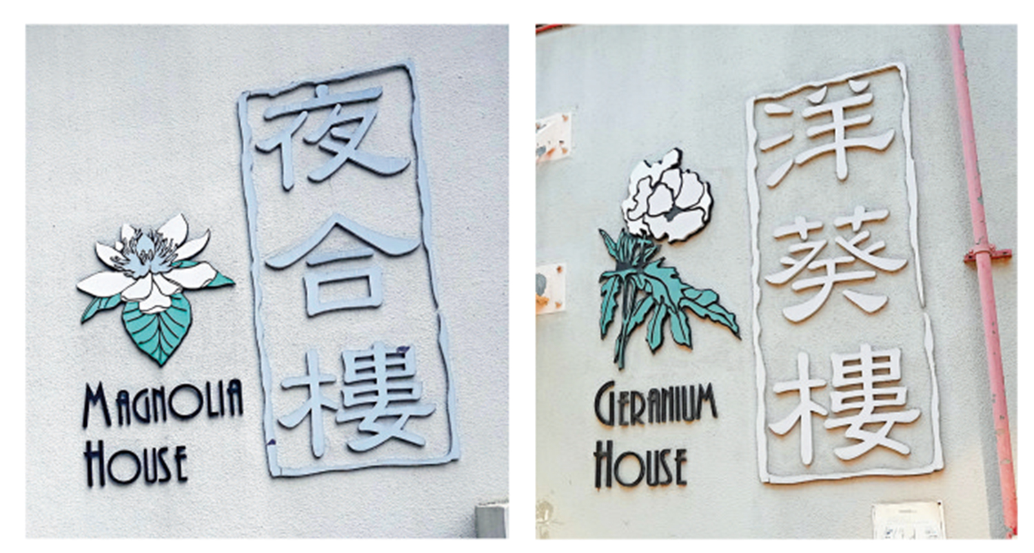 屋邨其中一個特色是大廈的名字別出心裁,以不同的花卉命名:洋葵樓、水仙樓、玫瑰樓、夜合樓、芙蓉樓,各座門口亦有相應的花卉圖案。大廈的英文名字是這些花朵的英文名,保留了名字美感。屋邨內的「凱旋門」亦是特色之一。