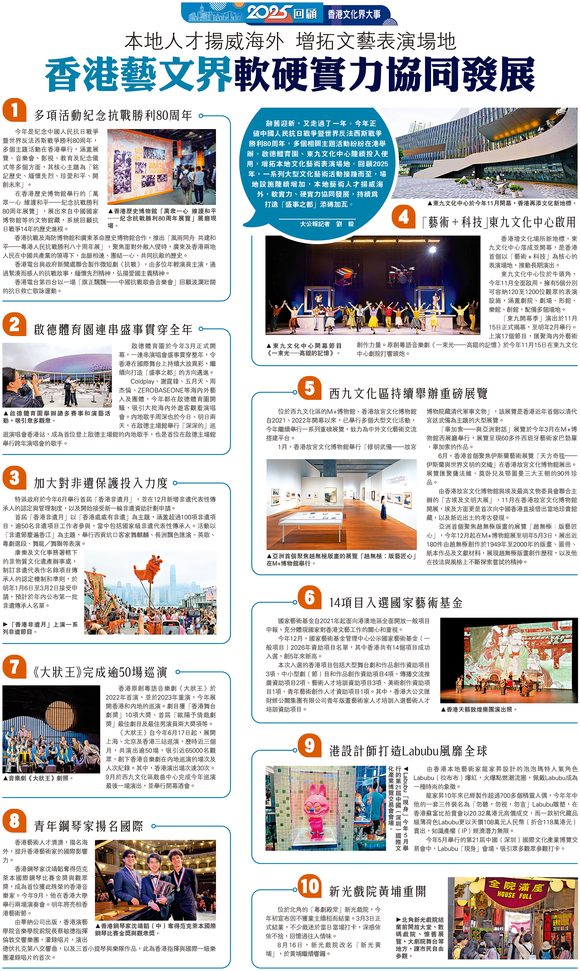 (大公報記者 劉 毅)辭舊迎新,又走過了一年。今年正值中國人民抗日戰爭暨世界反法西斯戰爭勝利80周年,多個相關主題活動紛紛在港舉辦。啟德體育園、東九文化中心陸續投入使用,增拓本地文化藝術表演場地。回顧2025年,一系列大型文化藝術活動接踵而至,場地設施陸續增加,本地藝術人才揚威海外,軟實力、硬實力協同發展,持續為打造「盛事之都」添磚加瓦。