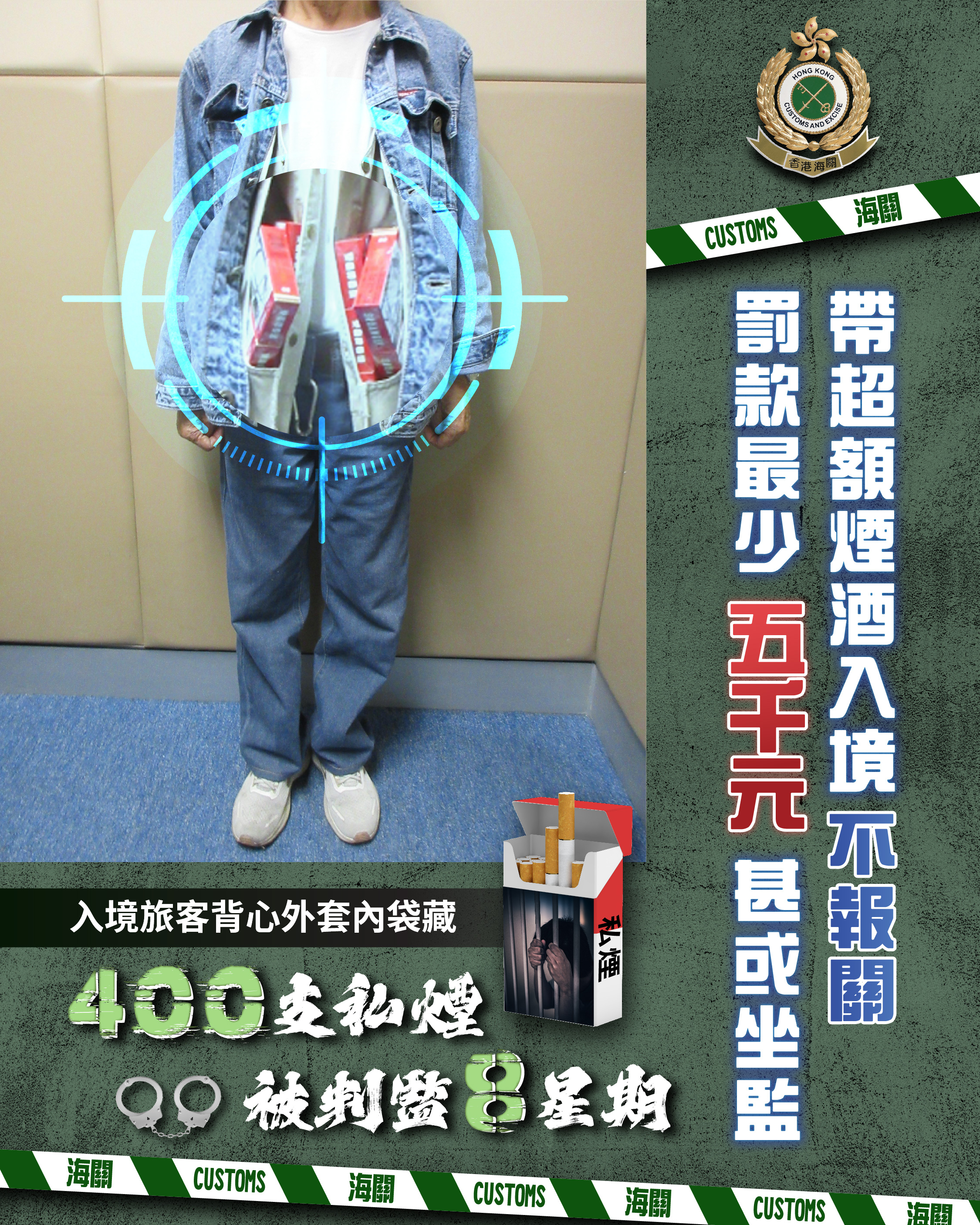 一名入境男旅客因管有未完稅香煙和未有向香港海關人員作出申報,違反香港法例《應課稅品條例》(《條例》),十二月二十九日在粉嶺裁判法院被判處監禁八星期。