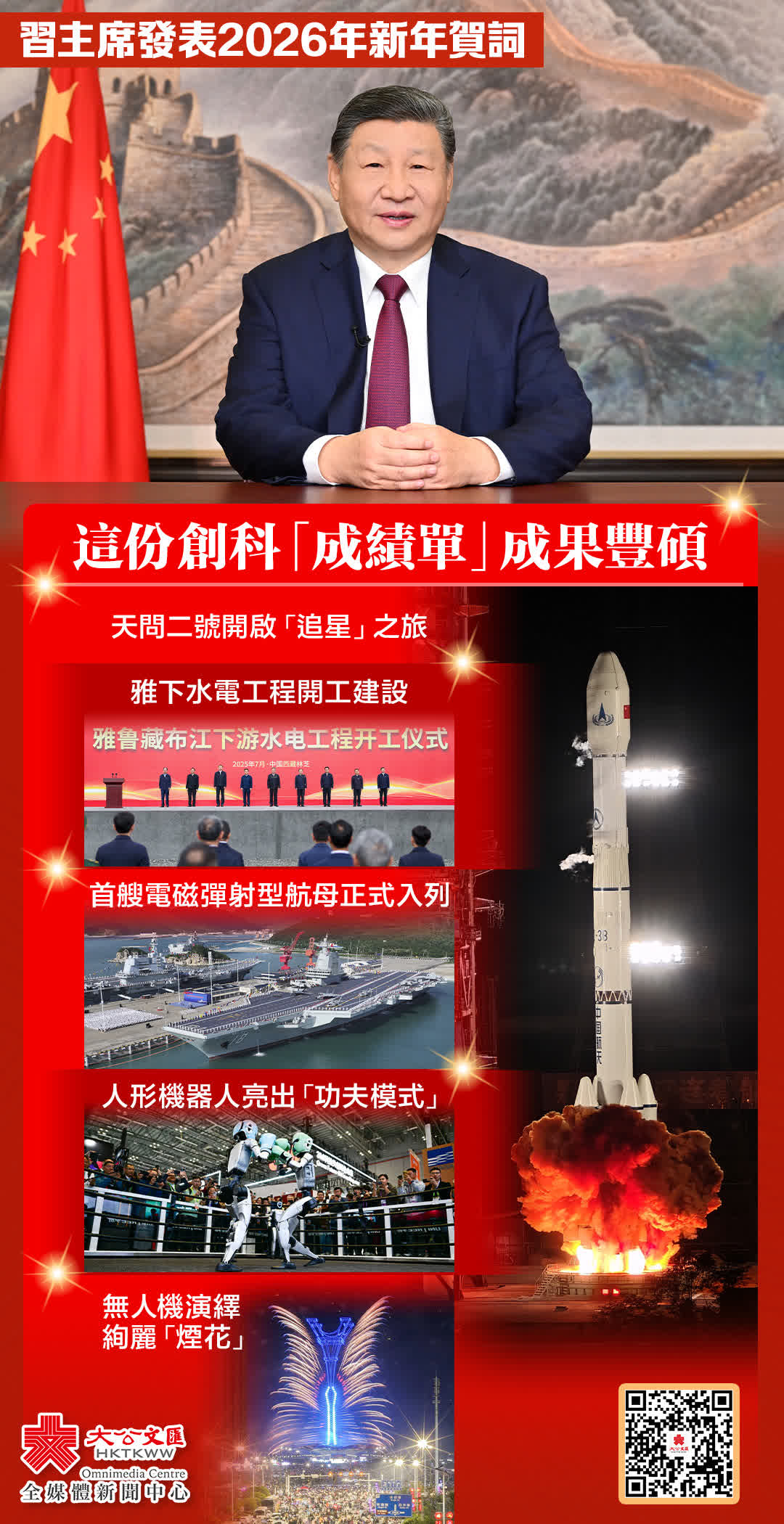 習近平提到:「天問二號開啟『追星』之旅,雅下水電工程開工建設,首艘電磁彈射型航母正式入列。人形機器人亮出『功夫模式』,無人機演繹絢麗『煙花』。創新創造催生了新質生產力,也讓生活更加多姿多彩。」