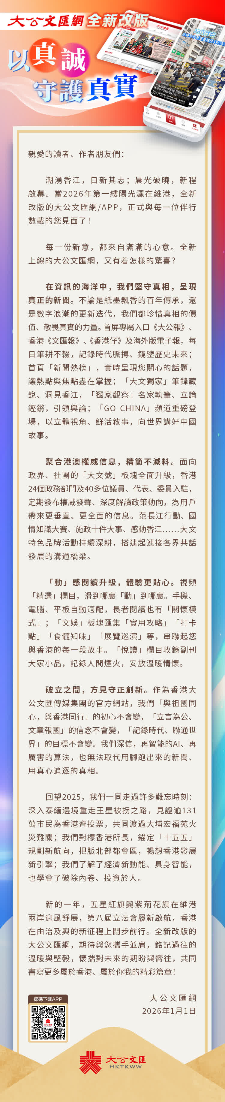 潮湧香江,日新其志;晨光破曉,新程啟幕。當2026年第一縷陽光灑在維港,全新改版的大公文匯網/APP,正式與每一位伴行數載的您見面了!