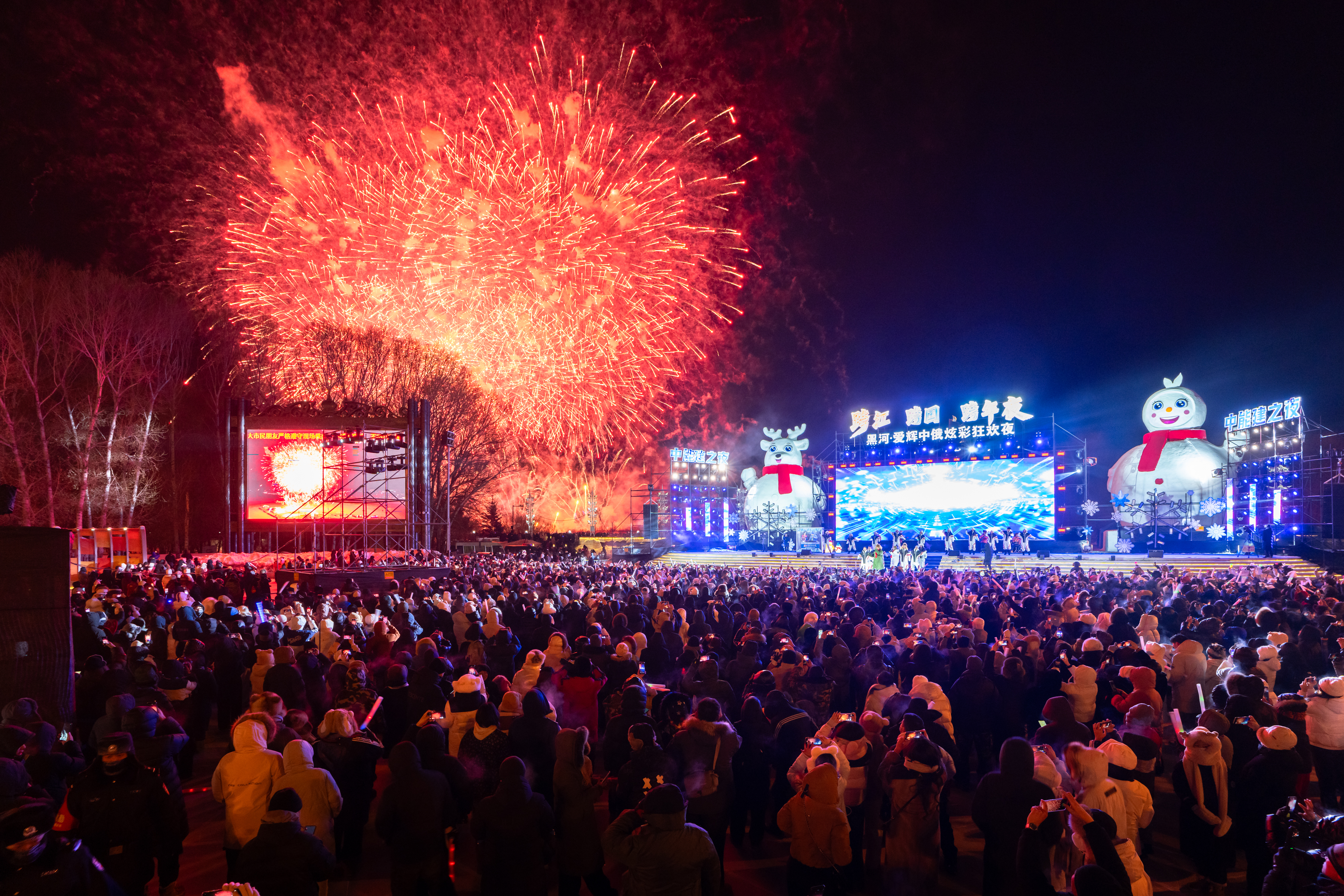12月31日晚,黑龍江畔的黑河市熱鬧非凡,「跨江・跨國・跨年夜」系列活動在此盛大舉行。中俄免簽政策為這場盛會帶來了極大便利,讓兩國民眾的交流更加頻繁。傍晚時分,黑河世紀廣場人頭攢動,不少外地遊客專程趕來體驗這場邊境跨年盛會。