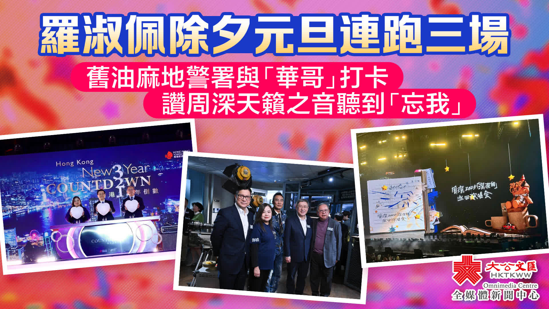 大公文匯全媒體報道,文化體育及旅遊局局長羅淑佩今日(1月1日)在社交平台發文指,今個新年香港給大家帶來了很多不同的活動,單是昨晚除夕到今天,她已出席由旅發局主辦的中環光影匯倒數活動、油蔴地警署「光影之旅」結合「雜差房」和港產警匪片元素的新旅遊熱點,和在啟德主場館舉辦的周深「深深的」演唱會香港站。