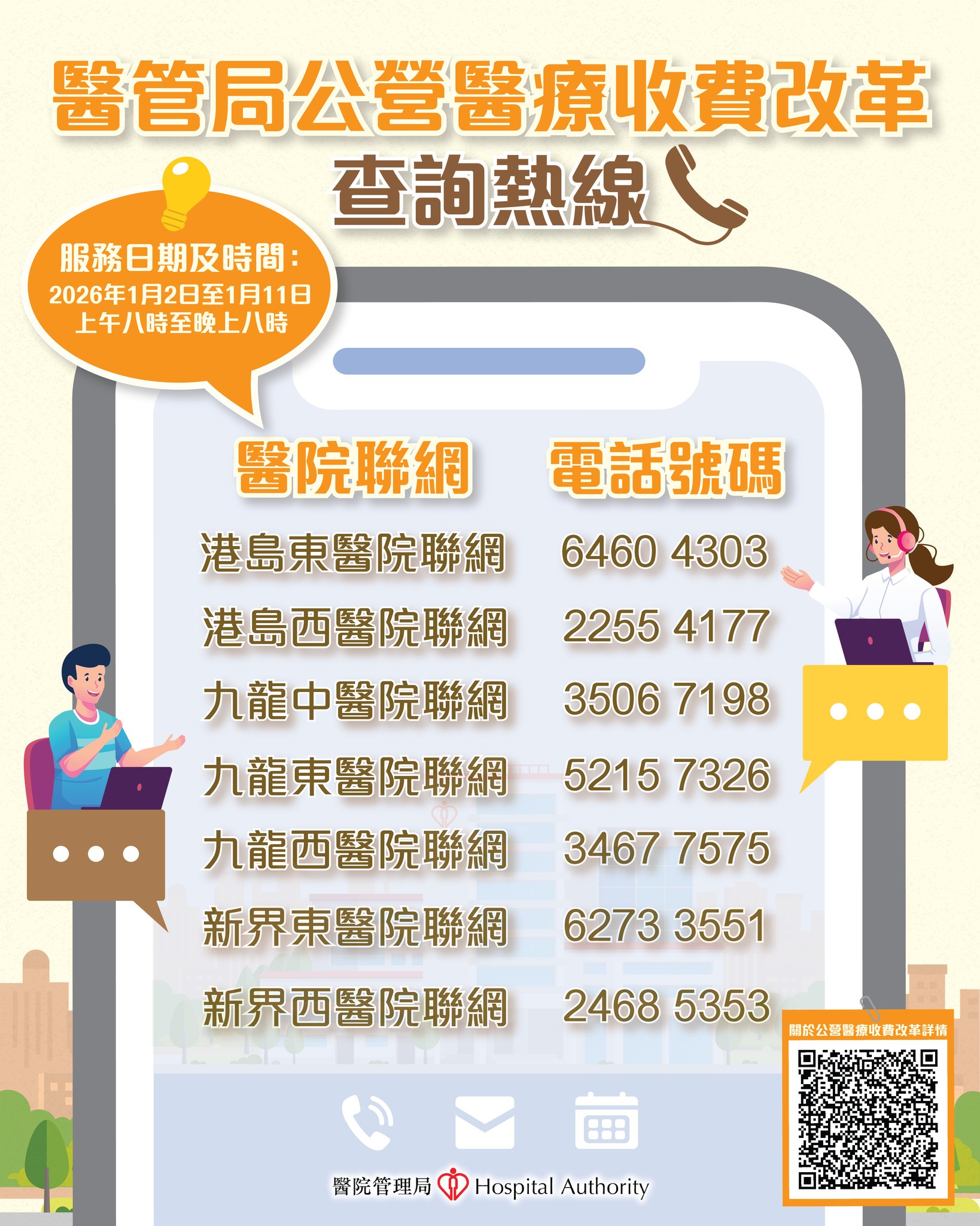 大公文匯全媒體報道,公營醫療收費改革已於1月1日實施,旨在加強保障病人、理順公營醫療服務及推動公營醫療持續發展。醫管局今日(1月2日)在社交平台發文表示,醫管局公營醫療收費改革查詢熱線於今日至1月11日提供服務,時間為上午8時至晚上8時。