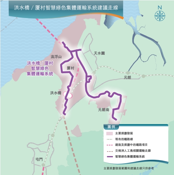 系統第一階段道路工程全長約4.5公里,擬設7個車站,連接泥圍和洪水橋/厦村新發展區內已規劃的物流、企業和科技區及住宅區,以及連接興建中的屯馬綫洪水橋站、輕鐵泥圍站、規劃中的港深西部鐵路(洪水橋至前海)及區內的運輸交匯樞紐,以配合洪水橋/厦村新發展區的第二期發展。