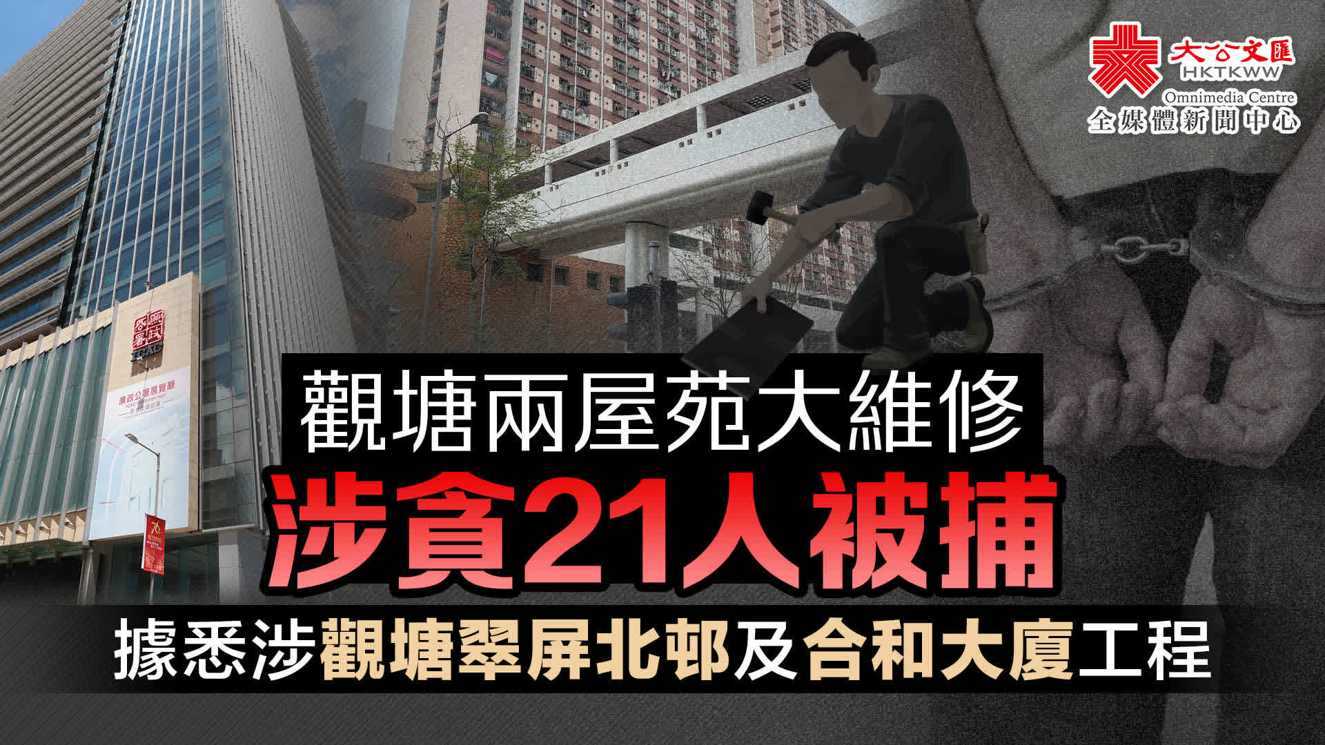 大公文匯全媒體報道,廉政公署(廉署)今日(2日)公布,上星期採取執法行動,打擊一個有黑社會背景人士操縱的樓宇維修貪污團夥,涉及觀塘區兩個屋苑的大維修工程,先後拘捕共21名人士,包括該貪污團夥的骨幹成員。最新消息指,事件分別涉及翠屏北邨及合和大廈工程。