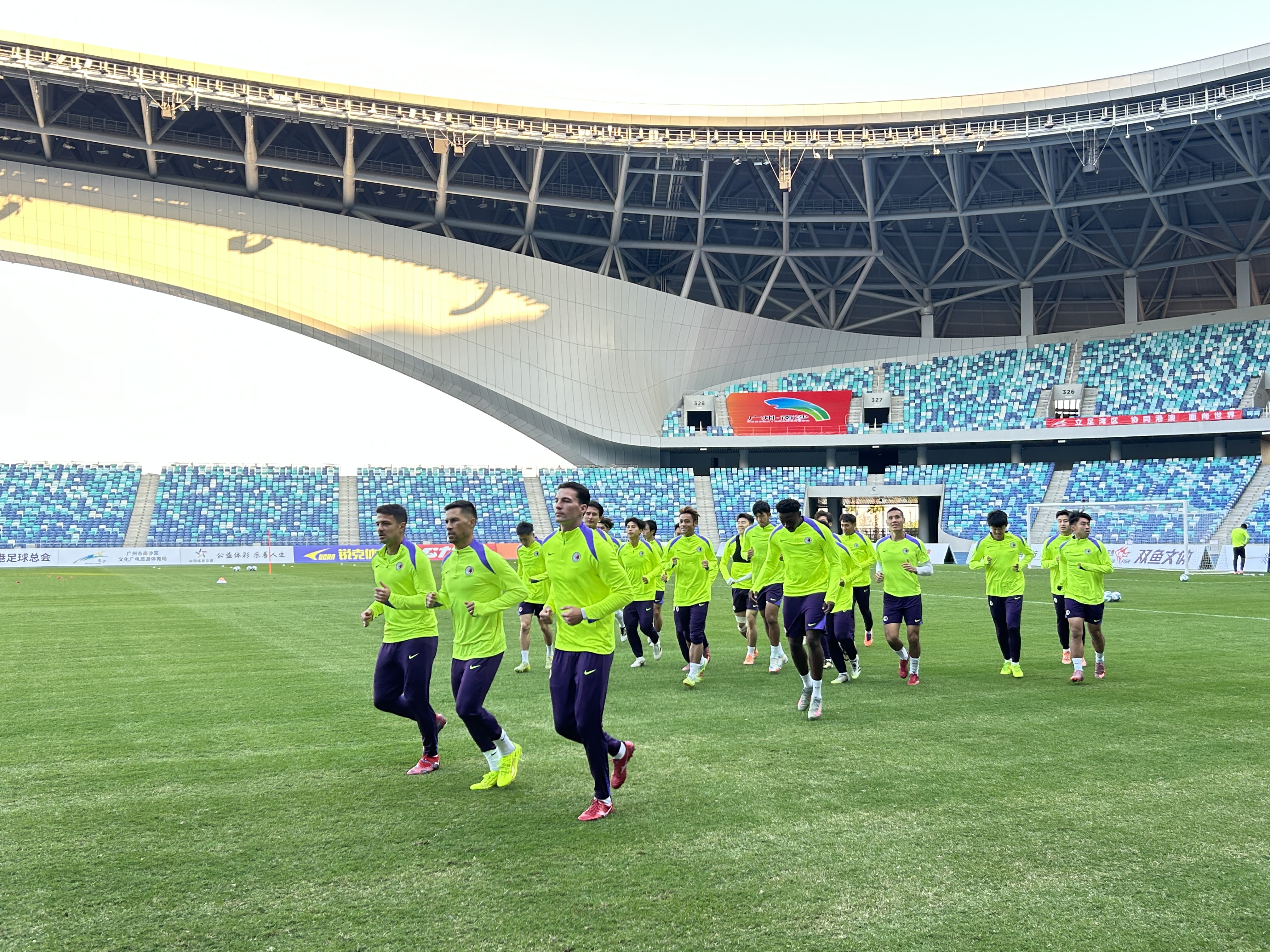 2日下午5時左右,港隊教練員、隊員一行近30人來到大灣區文化體育中心,立即投入緊張的訓練。在進行了場地草皮適應和體能訓練後,全體隊員在教練組的指導下進行了技戰術演練。記者現場所見,港隊人員齊整,首回合比賽港隊攻破廣東隊球門的孫銘謙、艾華頓均出現在訓練場地中。