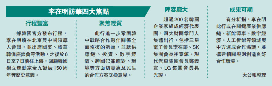 時隔6年,韓國企業「天團」再度來華尋覓商機。韓媒披露,三星電子會長李在鎔、SK集團會長崔泰源、現代汽車集團會長鄭義宣、LG集團會長具光謨等200多名韓國企業家組成經濟代表團,將隨同李在明訪華。