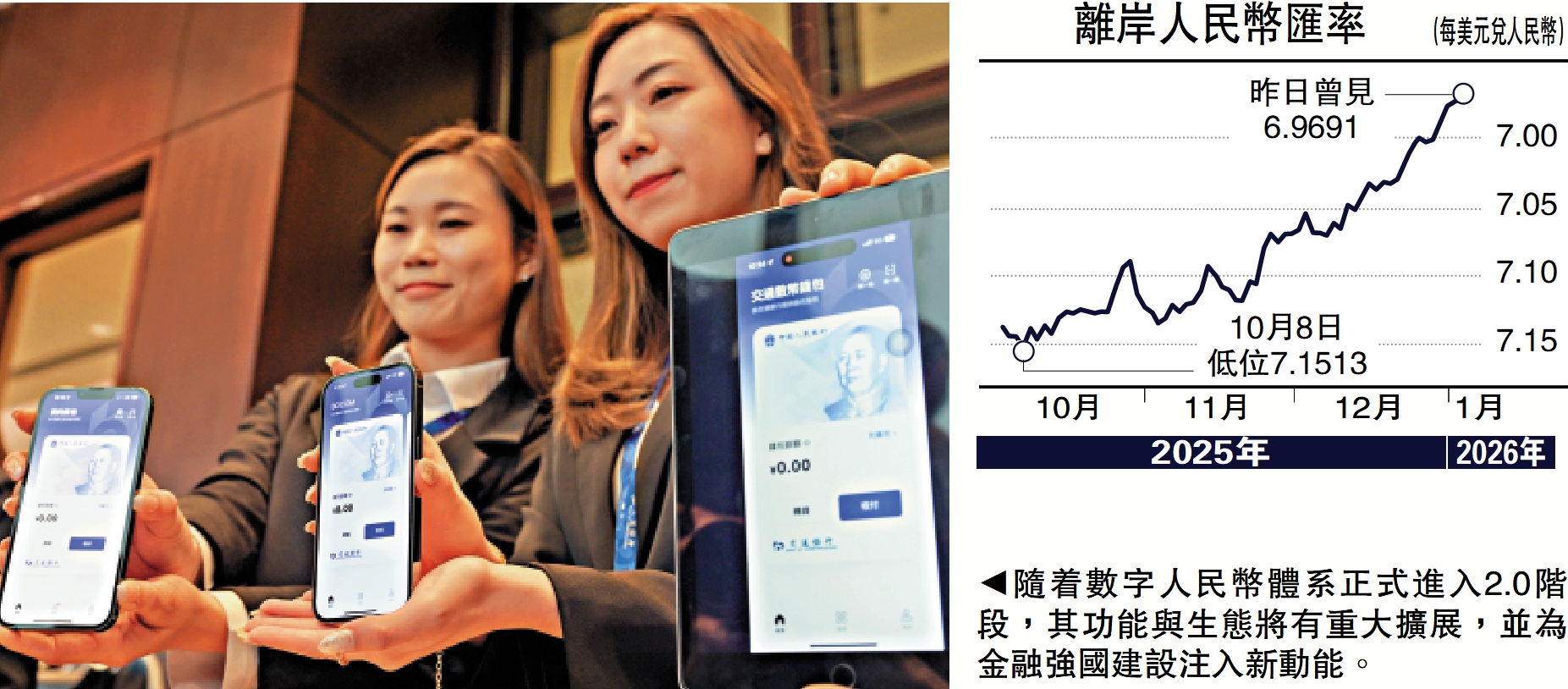 其次,「十五五」規劃明確指出,「推進人民幣國際化,提升資本項目開放水平」。而適度偏強的匯率預期有助於實現人民幣國際化目標。事實上,近期人民幣國際化舉措不斷。1月1日,數字人民幣體系正式進入2.0階段。此次升級的重要內容,就是將數字人民幣界定為可計息、納入銀行資產負債表、計入存款準備金,並受到存款保險保障的數字存款貨幣(Digital Deposit Money)。此舉標誌着數字人民幣功能與生態的重大擴展,為金融強國建設注入新動能。
