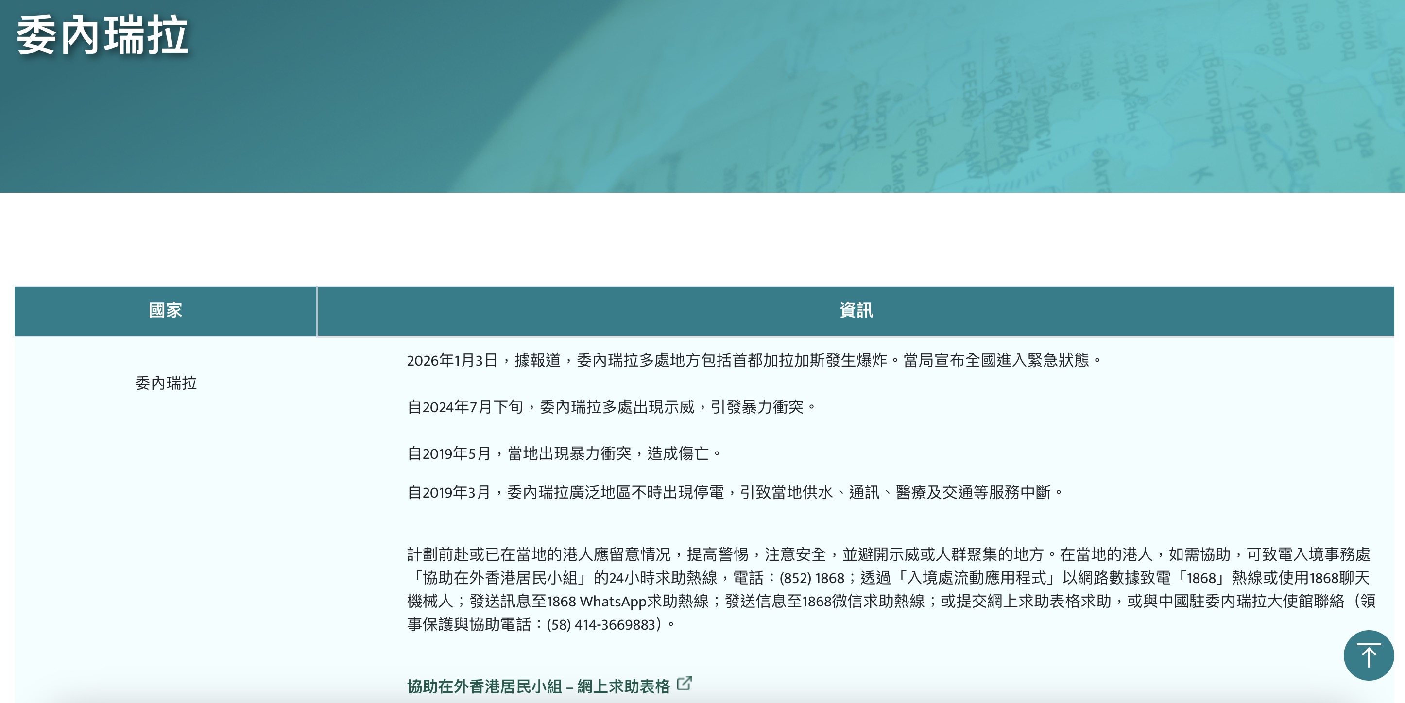 大公文匯全媒體報道,當地時間1月3日凌晨1點57分,委內瑞拉首都加拉加斯多處遭到空襲。香港保安局回覆傳媒查詢時表示,縱然委內瑞拉並未涵蓋於外遊警示制度下,保安局外遊警示制度網頁內的「其他資訊」部分亦就委內瑞拉的情況提供相關資訊供市民參考。鑑於委內瑞拉的最新情況,保安局已於1月3日更新外遊警示網頁有關委內瑞拉的附加資料,提醒計劃前赴或已在當地的港人應留意情況,提高警惕,注意安全,並避開示威或人群聚集的地方。