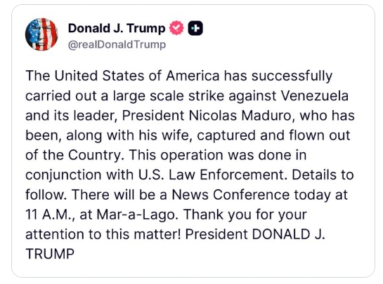 據悉,此次行動是與美國執法部門聯合進行的。當地時間1月3日上午11點(北京時間1月4日凌晨0點),特朗普將在海湖莊園舉行新聞發布會,公布此次行動後續細節。