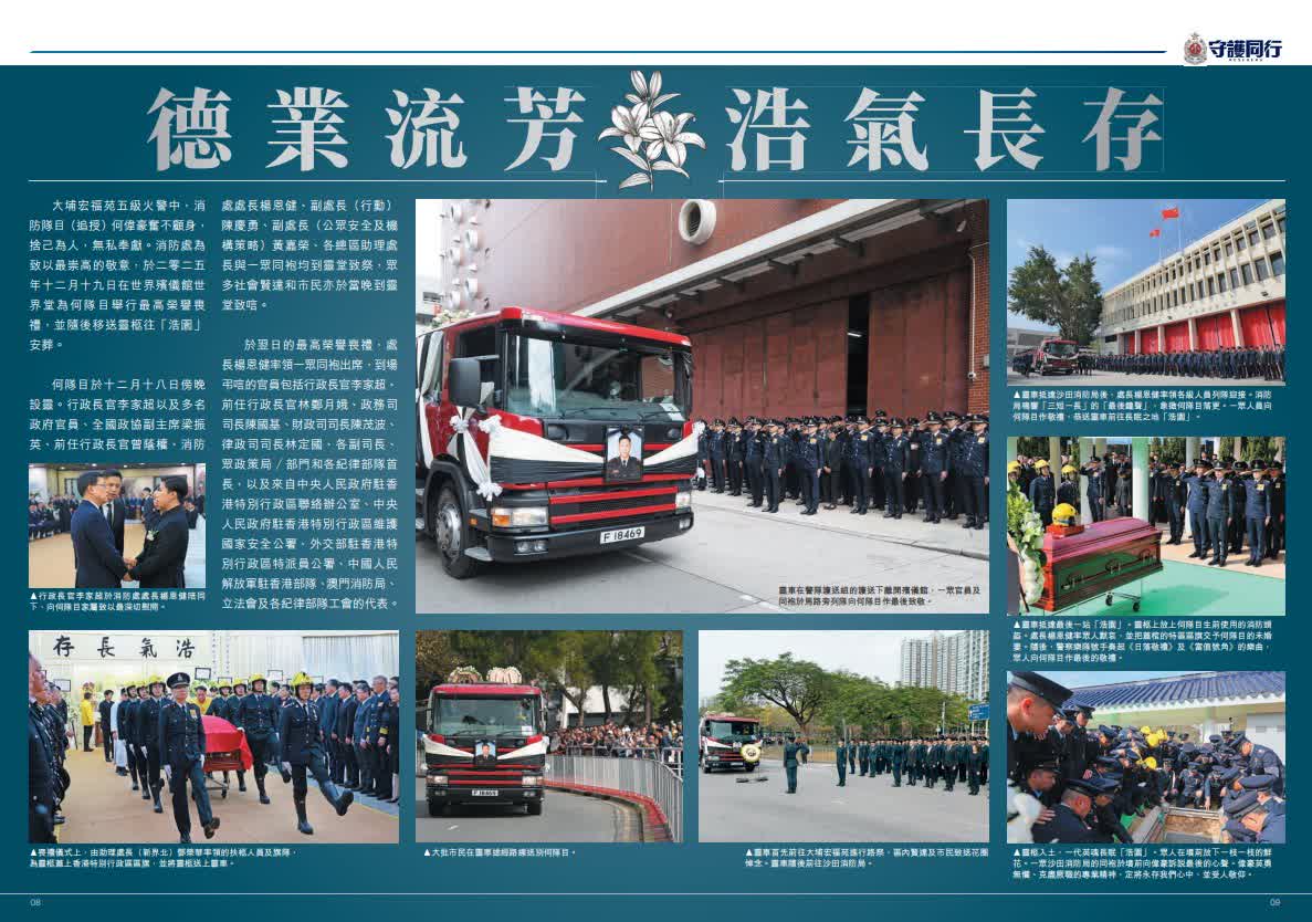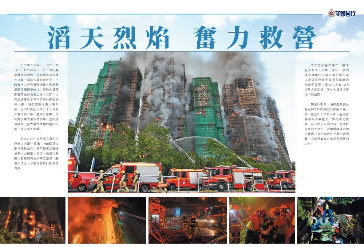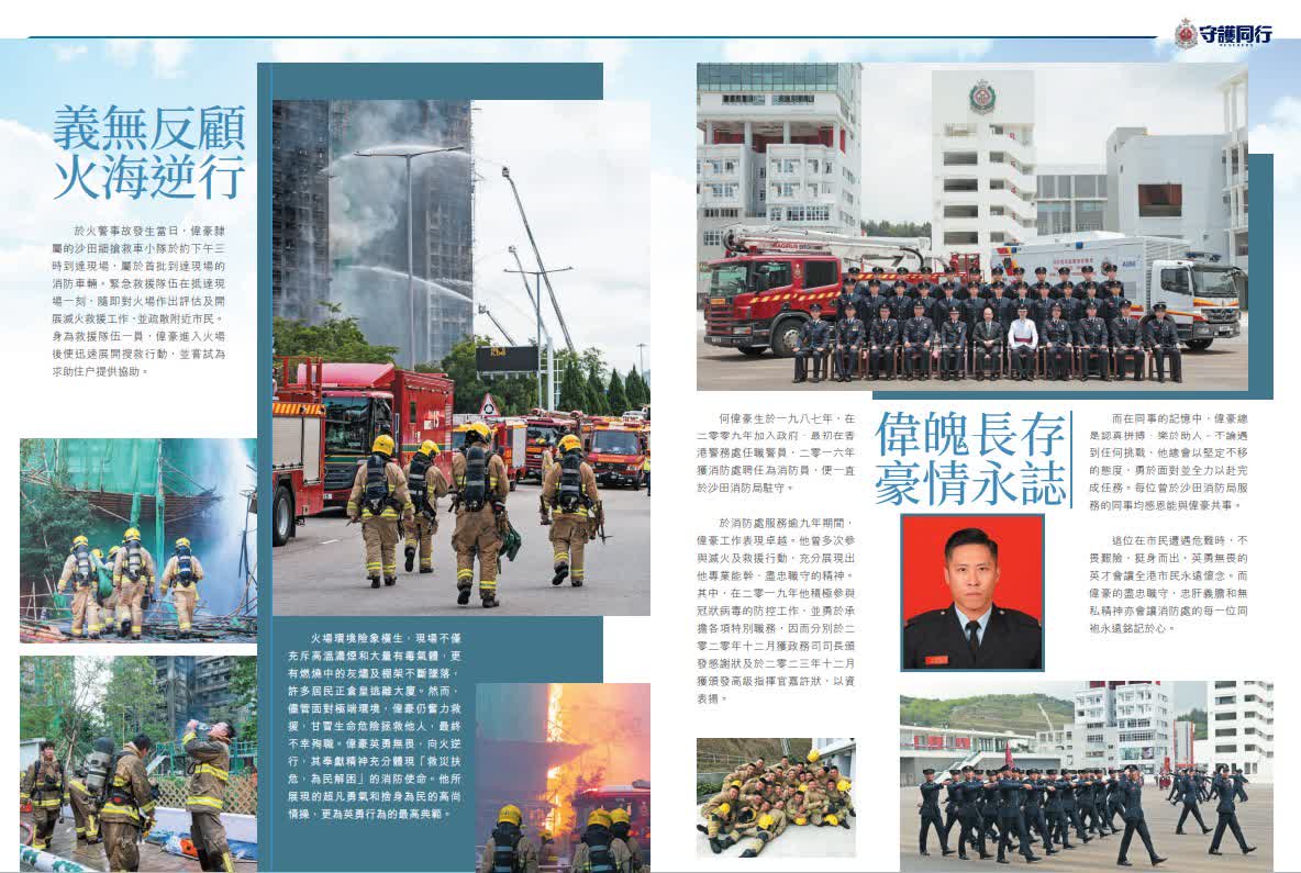大埔宏福苑大火造成重大傷亡,罹難者中包括英勇殉職的消防員何偉豪,行動中亦有12名消防員受傷,所有傷員治理後均已出院。消防處刊物《守護同行》為了悼念何偉豪而製作特刊,記錄了包括何偉豪在內的消防員奮勇救援的工作,以及同袍、家人、未婚妻與市民對何偉豪的深情緬懷。