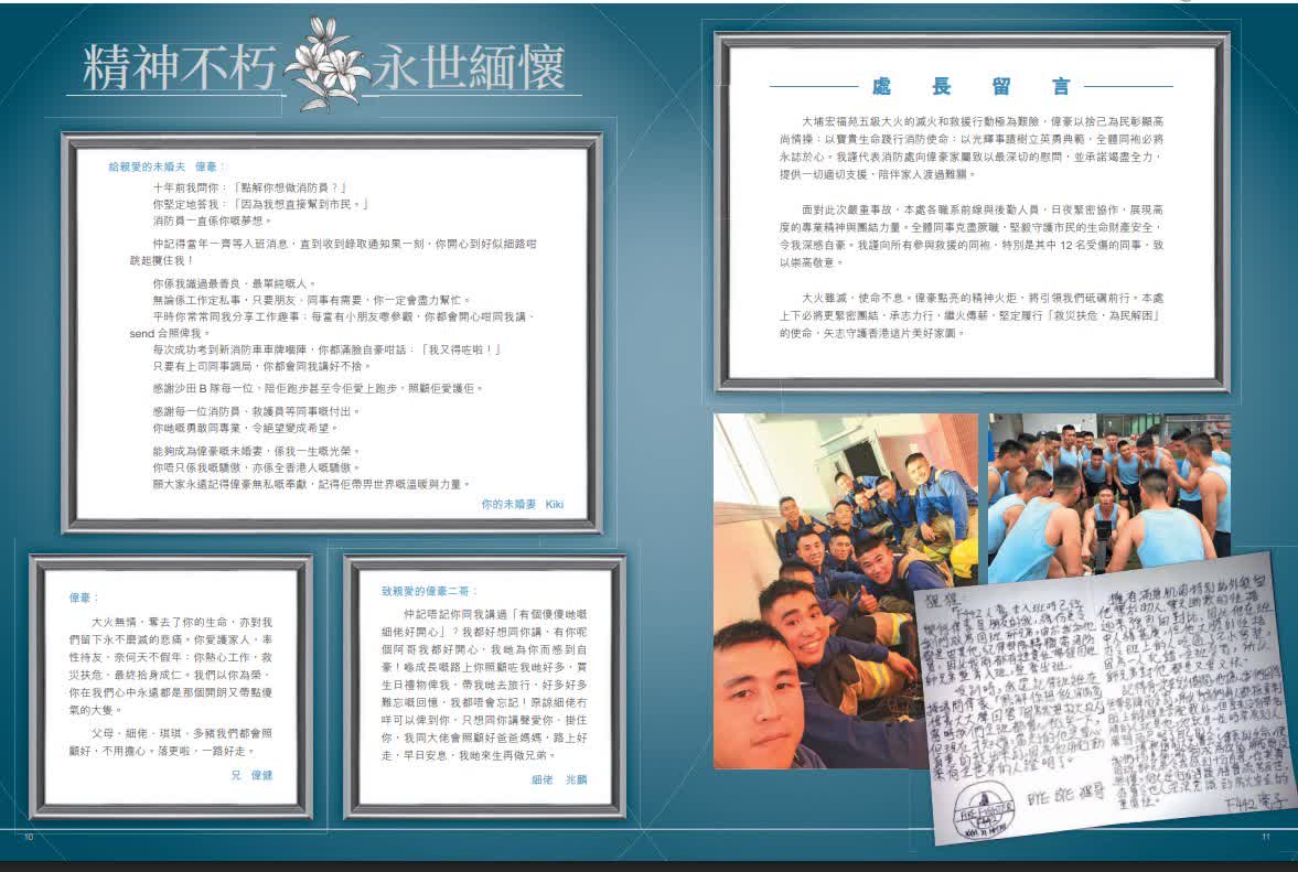 在同事的記憶中,何偉豪總是認真拚搏,樂於助人。不論遇到任何挑戰,他總會勇於面對並全力以赴完成任務。每位曾於沙田消防局服務的同事均感恩能與偉豪共事,其盡忠職守、忠肝義膽和無私精神讓每一位同袍永遠銘記,讓全港市民永遠懷念。