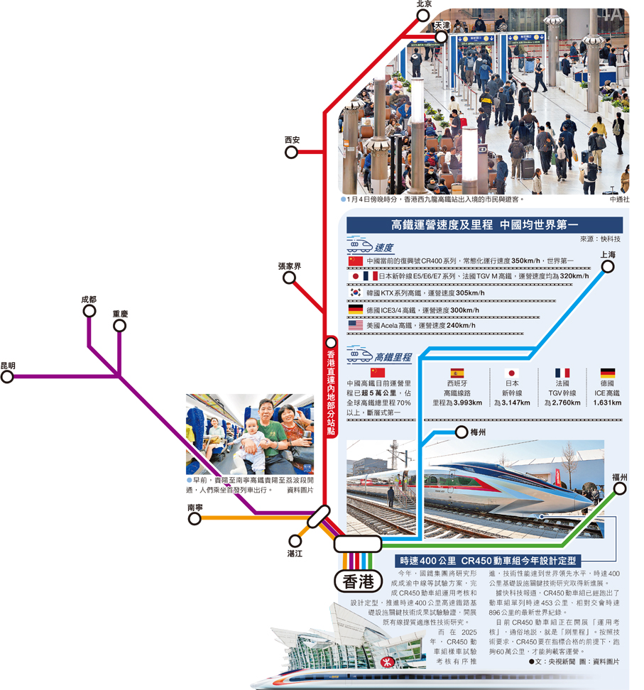 目前,香港到北京、上海8小時直達,3小時即可從香港到長沙吃臭豆腐喝「茶顏悅色」,7個半小時就可以到達「四季如春」的昆明,進而到瀘沽湖探尋女兒國的奧秘,再到「天府之國」成都、霧都重慶、福建遊玩和吃美食……「十四五」期間,全國鐵路營業里程由14.63萬公里增至16.5萬公里、增長12.8%,高鐵由3.79萬公里增至5.04萬公里、增長32.98%,中國建成世界規模最大、先進發達的高速鐵路網;全路杜絕了造成旅客死亡的責任行車事故,鐵路安全進入歷史上比較穩定的時期。香港遊客如於中途轉乘其他高鐵列車,亦可沿國家高鐵網絡前往更多目的地。