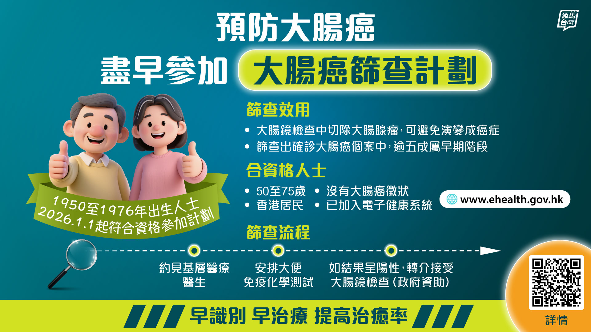 由1月1日起,1950至1976年出生的香港居民符合資格參加政府資助的大腸癌篩查計劃。大腸癌是本港第三常見癌症,亦是本港致命癌症中第二位。合資格人士應於50歲開始參加計劃,如篩查結果正常,每兩年一次覆檢至75歲,以降低大腸癌風險。計劃以公私營協作模式推行,看圖了解詳情。