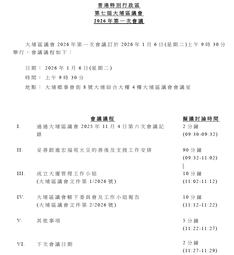 大公文匯全媒體報道,大埔宏福苑火災距今發生已經一個多月,大埔區議會將於明早(6日)舉行區議會大會,議程中有90分鐘涉及討論妥善跟進宏福苑火災的善後及支援工作安排。消息指,開會前會有默哀儀式,向宏福苑死難者致以沉重哀悼。