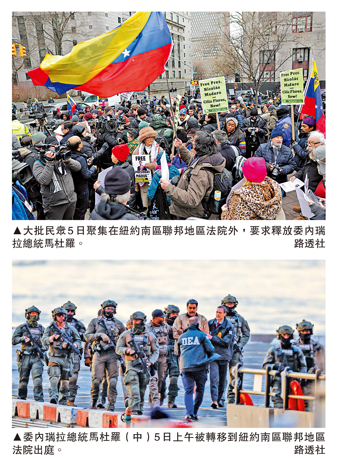 大公報綜合報道,遭美國強行控制的委內瑞拉總統馬杜羅被帶至紐約南區聯邦地區法院,於當地時間5日中午12時許(本港時間6日凌晨1時許)首度出庭,並拒絕認罪。美國司法部指控馬杜羅犯有毒品恐怖主義陰謀罪等多項罪名。然而,多名美國法律專家指出,至今沒有證據能直接證明馬杜羅本人指揮或參與了毒品走私活動。分析指,美國對委內瑞拉的干涉、對總統的綁架,是一種赤裸裸、毫不掩飾的國際破壞行為。美國強行控制一位現任國家元首,在國際法中毫無立足點。