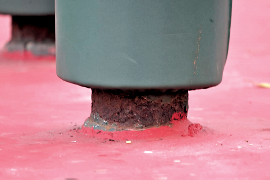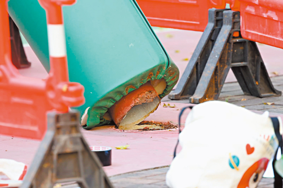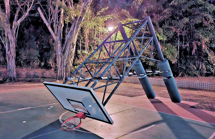 香港文匯報記者昨午返回冧籃球架所在的土瓜灣靠背壟道遊樂場,場內塌下的籃球架仍未移走,斷開的兩支鐵柱底部可見銹蝕得相當嚴重,其與對面另一個同款籃球架俱被圍封,以免途人接近。現場則有一名男子蹲在斷開的籃球架支柱底部,疑似了解設施的損毀情況。
