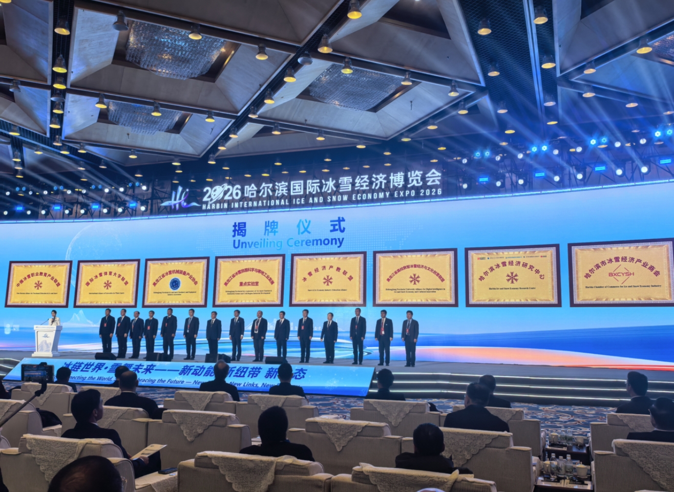 開幕式同步舉行8家冰雪經濟相關機構揭牌儀式與7個重點項目簽約儀式。黑龍江省冰雪旅居科學與寒地工業發展重點實驗室、國際冰雪體育大學聯盟等機構的成立,將完善「政產學研用」融合生態;簽約項目涵蓋冰雪裝備製造、旅遊開發、金融授信等領域,15家合作單位攜手發力,為冰雪經濟全產業鏈升級提供堅實支撐。