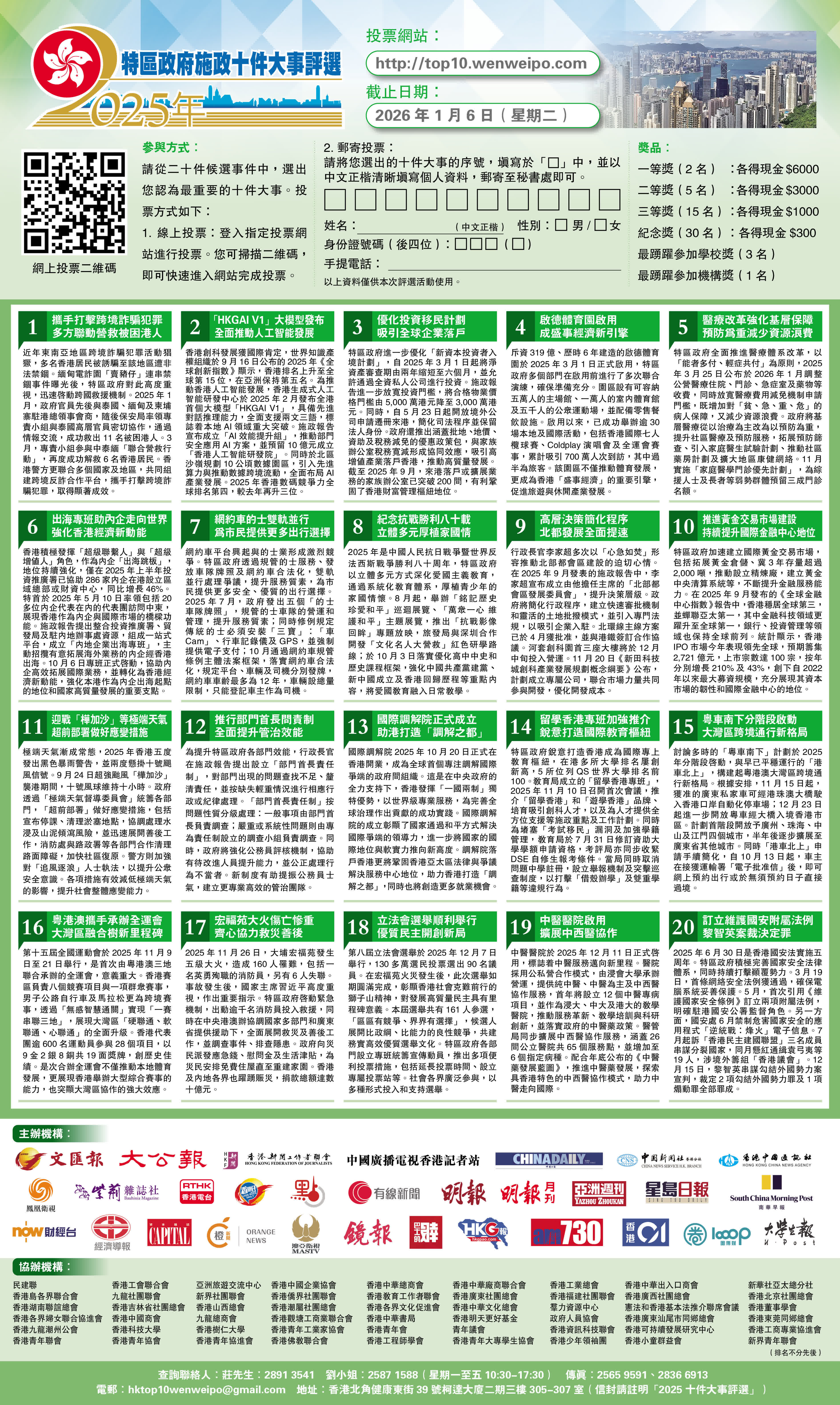 本次評選的參與方式快捷簡便,市民可瀏覽活動官方網站(https://top10.wenweipo.com)了解詳情並進行投票。為鼓勵廣泛參與,活動亦設有豐富獎品,共設一等獎(兩名)、二等獎(五名)、三等獎(十五名)、紀念獎(三十名)、「最踴躍參加學校獎」(三間)及「最踴躍參加機構獎」(一間)。參與者不僅有機會獲獎,更有望獲邀出席頒獎典禮,與社會賢達交流。