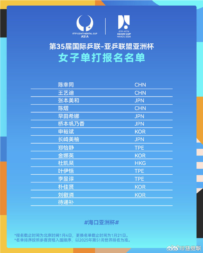 大公文匯全媒體報道,第35屆國際乒聯-亞乒聯盟亞洲盃將於2026年2月4日至8日,在中國海口市五源河體育館舉行。本屆亞洲盃設男女單打兩個項目,各有32名球員參賽。海口亞洲盃報名球員名單現已公布。