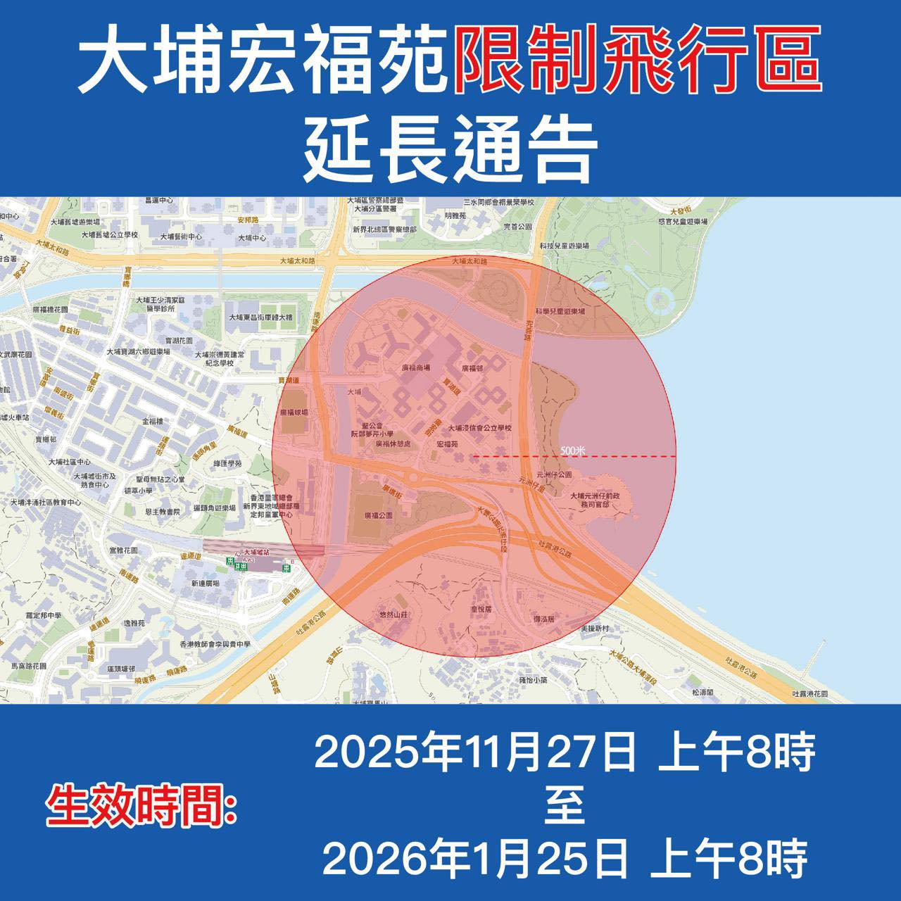 大公文匯全媒體報道,警方今日(6日)表示,鑒於公眾安全,警務處在大埔宏福苑範圍已設立「限制飛行區」,生效時間將由2026年1月11日上午8時延長至2026年1月25日上午8時。